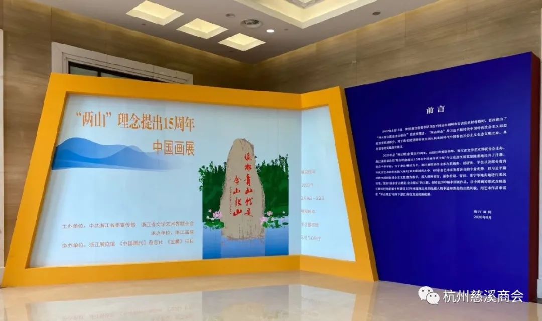 8月14日下午,“绿水青山就是金山银山”理念提出15周年中国画展在浙江展览馆举办开幕仪式,本次画展由中共浙江省委宣传部、浙江省文联主办,浙江画院承办,共展出了60余名艺术家约150件作品,杭州市慈溪商会副会长、桐庐黄公望画院院长黄伯君的《家在青山绿水间》520厘米X190厘米的巨幅作品在此展出,深受关注和好评。展览时间为8月9日—8月23日。