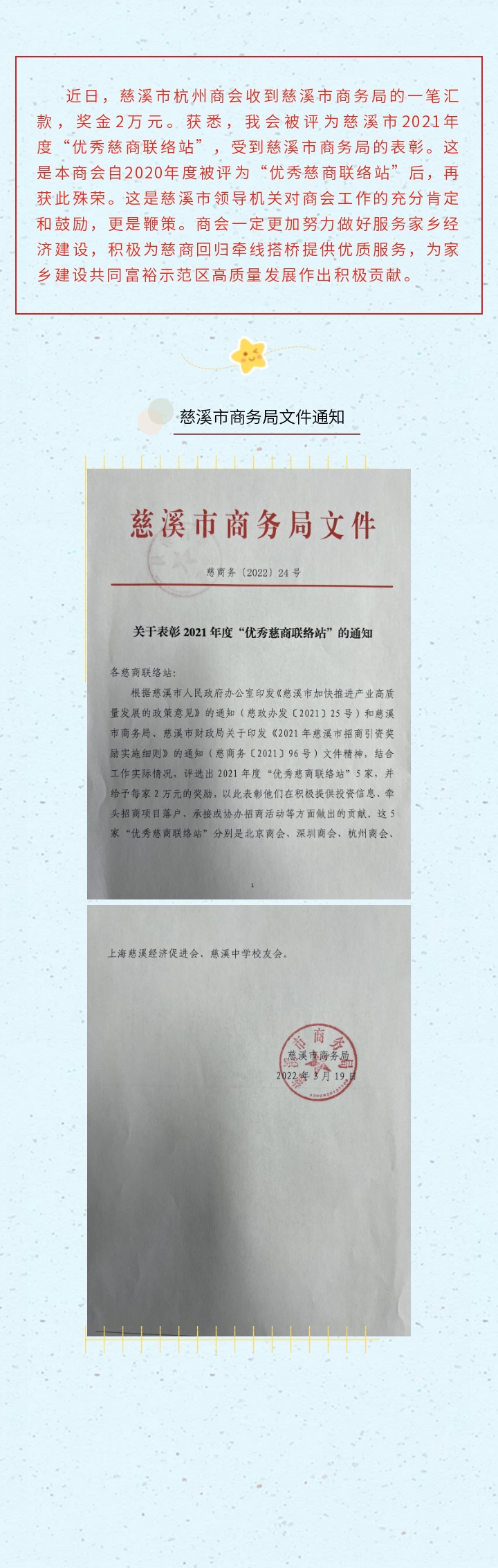 喜讯:本商会获评慈溪市2021年度“优秀慈商联络站”受到表彰