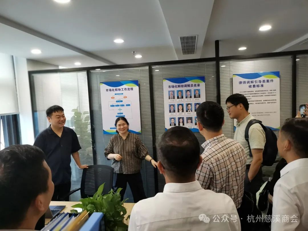 与会人员先参观了西湖区工商联商会调解中心,这是杭州市首个以市场化解纷机制运作的商会调解中心,位于文一西路858号西湖区行政服务中心东楼七楼西湖区工商联内,总建筑面积近90平方米。调解中心设接待室,受理室和调解室三大功能区,配备庭务主任1名,调解员12名,由西湖区人民法院提供业务指导。