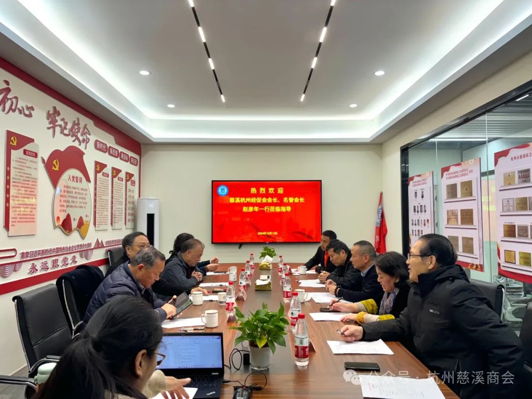 12月13日下午,省发改委原副主任、慈溪杭州经促会会长、商会名誉会长赵彦年一行莅临杭州市慈溪商会《会员之家》调研指导工作。受到商会会长陈越孟等商会领导的热烈欢迎和热情接待,并进行了座谈。