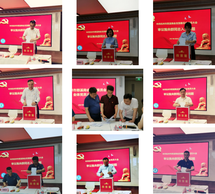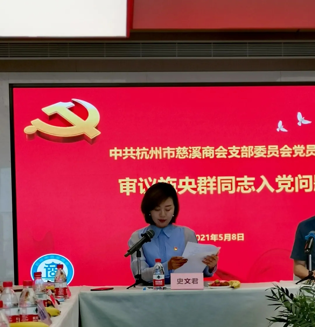 5月8日,中共杭州市慈溪商会支部委员会,在杭州市西溪路527号的浙商创投中心B座888会议室召开全体党员大会,会议审议并通过了施央群同志入党问题。党支部书记史文君,常务副会长华晔宇,支部委员胡鹏旭、黄承、邹长国、蒋迪新,党员张松、陈雷特、阮溯洄、李桑桑、施湖珊、朱晨,党建联络人、秘书长沈含惠和发展对象、商会理事施央群,入党积极分子赵炜炜、戴建鑫等16人出席和列席会议。