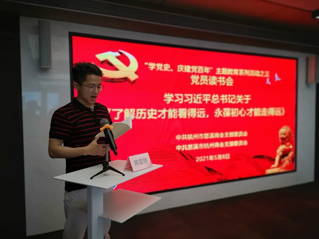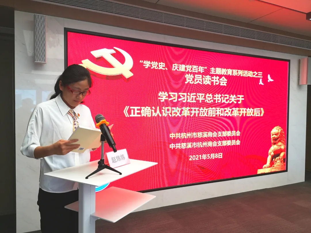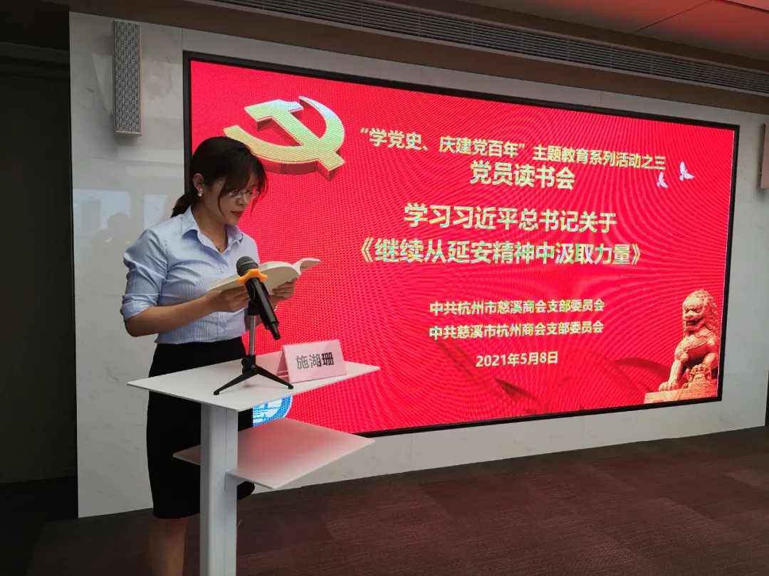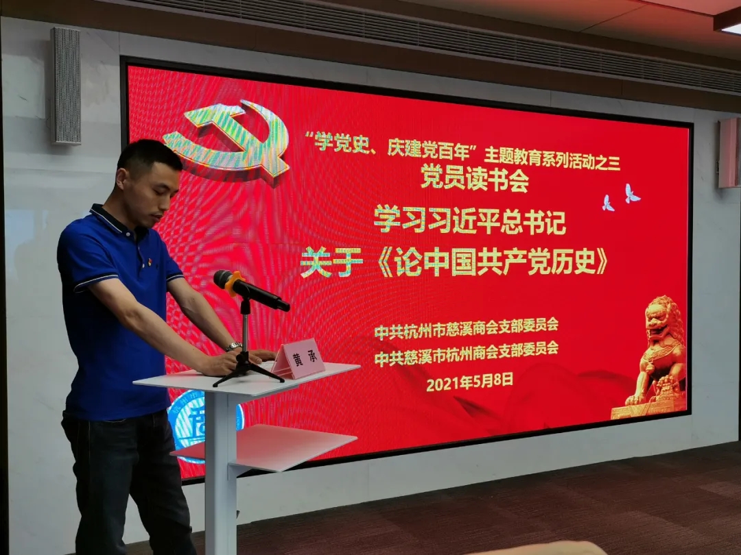 史文君主持会议,她说:从3月5日开始,我们支部积极响应党中央号召,及时召开党员大会动员商会党员和民营企业家开展“学党史,庆建党百年华诞”系列活动。首先组织学习了习总书记《在党史学习教育动员大会上的讲话》等重要文章;4月17日,组织党员、入党积极分子和商会青联部同志一起赴嘉兴南湖开展“追寻红色记忆,弘扬红船精神”活动;今天,我们是第三次学习,尝试以“党员读书会”的新形式组织大家学习,支部先买了二本书发给大家学习,一本是习近平《论中国共产党历史》,一本是《国民经济和社会发展第十四个五年规划和2035年远景目标纲要》,这二本书都很重要,对我们党、国家和人民今后的经济、社会发展和人民生活都有很重大意义,值得我们好好学习。今天的“党员读书会”,要求大家认真阅读党的历史、国家的发展史等重要文章。请每位同志依次上台领读或解读一篇文章。我们的学习采用组织大家一起通读原文和号召大家利用自己空余时间认真细读党史与坚持每天《学习强国》相结合的方式,通过学习达到:学史明理、学史增信、学史崇德、学史力行。从党的百年伟大奋斗历程中汲取前进的智慧和力量,不断提高自己的政治理论水平和素养,为庆祝中国共产党成立100周年,书写商会民营企业家应有的担当,为社会作出更大贡献。