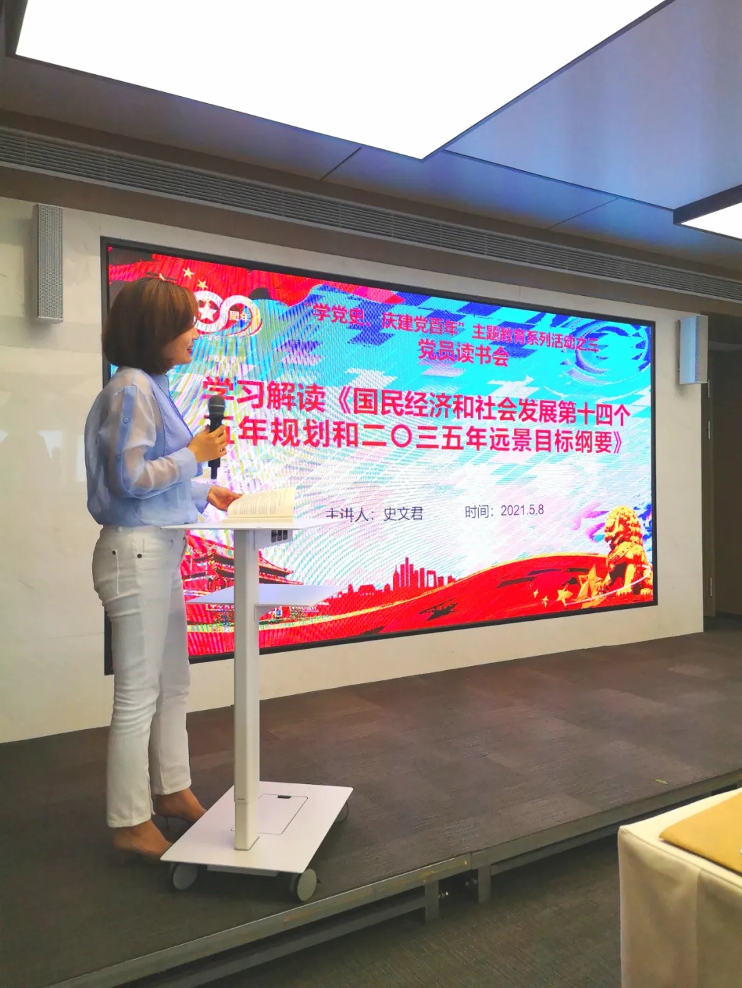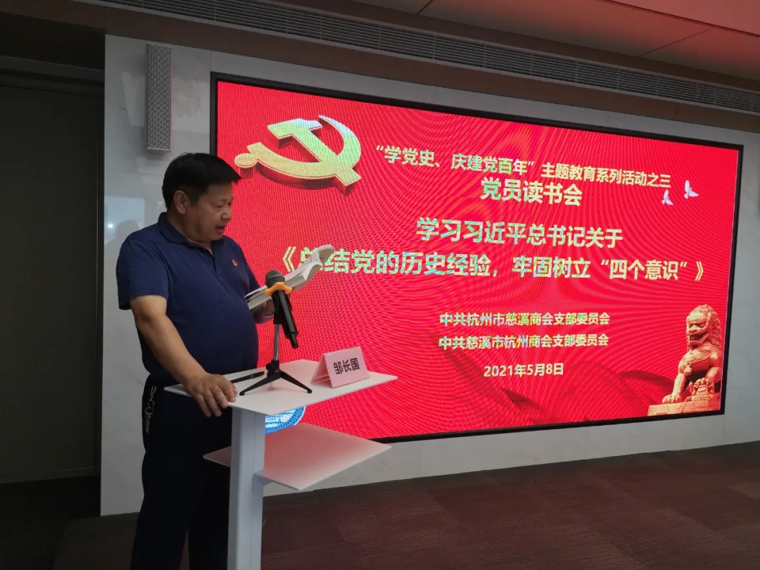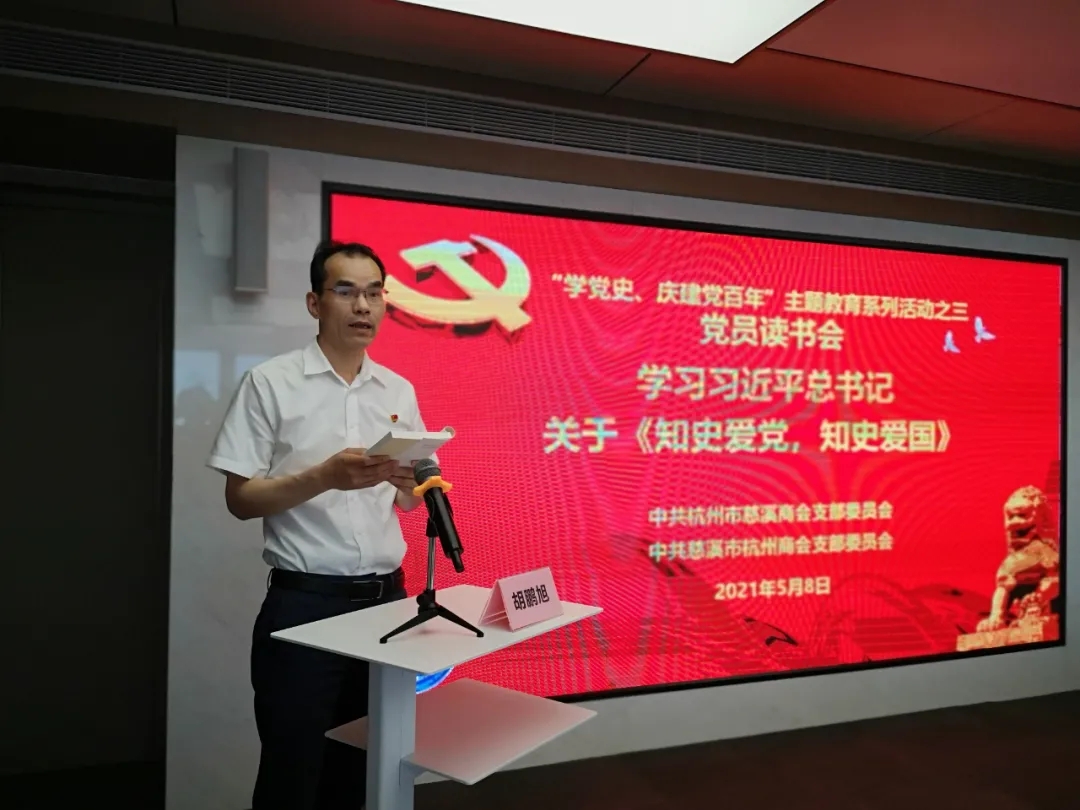 史文君主持会议,她说:从3月5日开始,我们支部积极响应党中央号召,及时召开党员大会动员商会党员和民营企业家开展“学党史,庆建党百年华诞”系列活动。首先组织学习了习总书记《在党史学习教育动员大会上的讲话》等重要文章;4月17日,组织党员、入党积极分子和商会青联部同志一起赴嘉兴南湖开展“追寻红色记忆,弘扬红船精神”活动;今天,我们是第三次学习,尝试以“党员读书会”的新形式组织大家学习,支部先买了二本书发给大家学习,一本是习近平《论中国共产党历史》,一本是《国民经济和社会发展第十四个五年规划和2035年远景目标纲要》,这二本书都很重要,对我们党、国家和人民今后的经济、社会发展和人民生活都有很重大意义,值得我们好好学习。今天的“党员读书会”,要求大家认真阅读党的历史、国家的发展史等重要文章。请每位同志依次上台领读或解读一篇文章。我们的学习采用组织大家一起通读原文和号召大家利用自己空余时间认真细读党史与坚持每天《学习强国》相结合的方式,通过学习达到:学史明理、学史增信、学史崇德、学史力行。从党的百年伟大奋斗历程中汲取前进的智慧和力量,不断提高自己的政治理论水平和素养,为庆祝中国共产党成立100周年,书写商会民营企业家应有的担当,为社会作出更大贡献。
