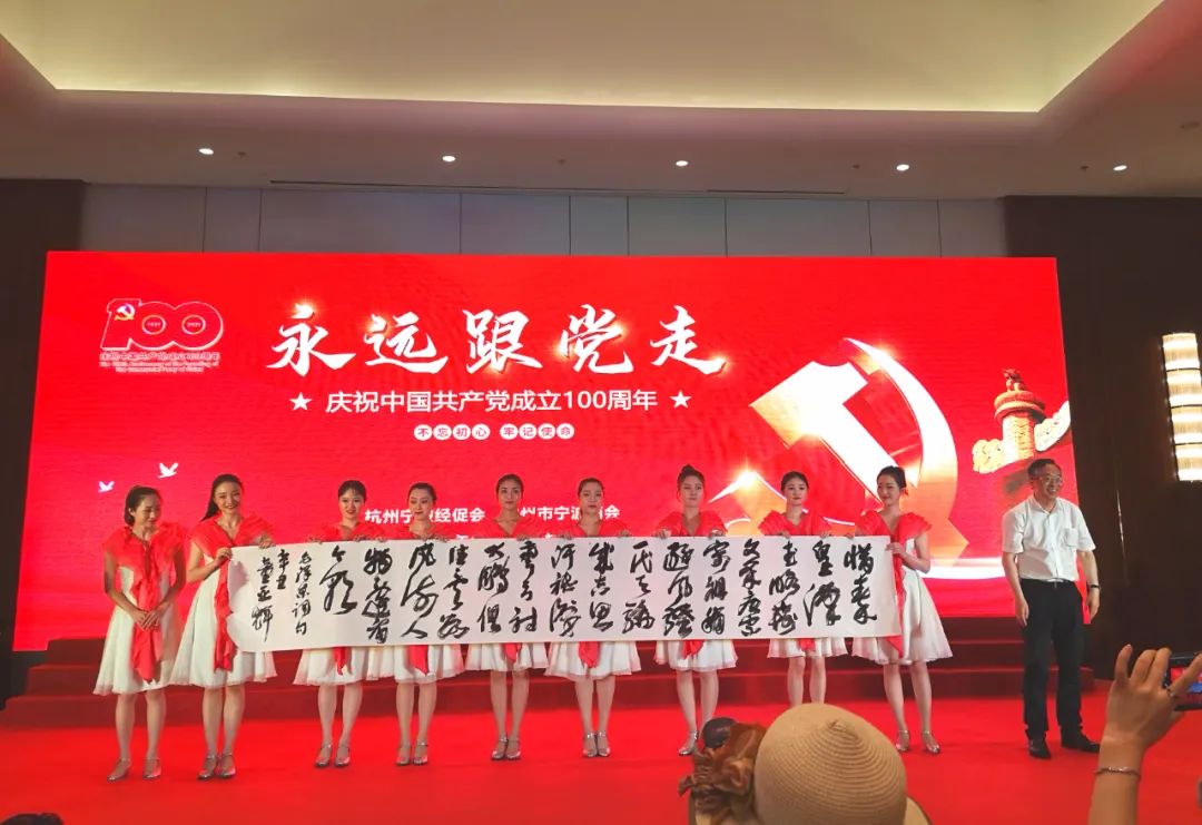 庆祝建党百年华诞文艺演出开始,严力波、王春燕主持。第一个节目,大合唱,省政协原副主席张蔚文、杭州宁波经促会、杭州宁波商会等领导和支部党员同台歌唱《没有共产党就没有新中国》;接着各县(区)选送的精彩节目先后上台演出。