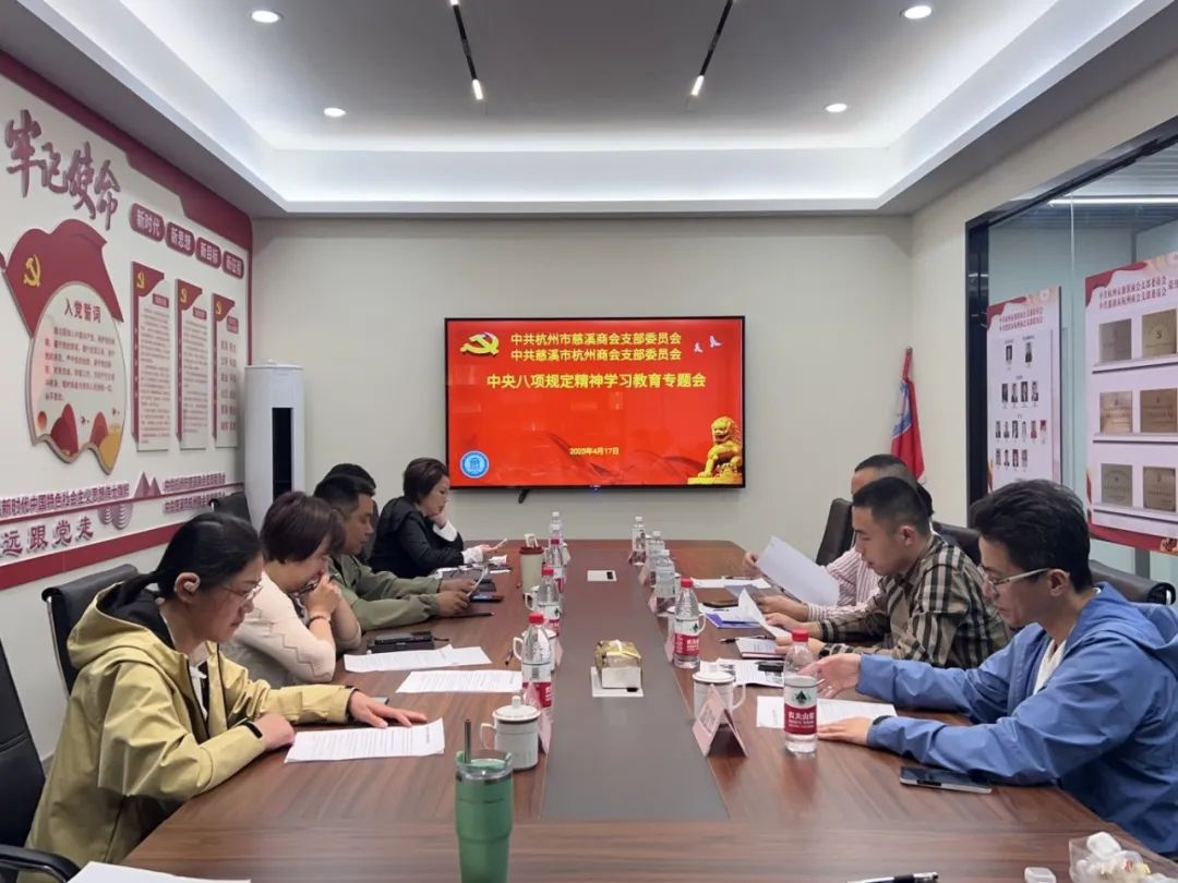 4月17日上午,中共杭州市慈溪商会支部委员会和中共慈溪市杭州商会支部委员会,在杭州市莲花峰路37号的杭州市慈溪商会《会员之家》组织召开了深入贯彻中央八项规定精神学习教育动员部署专题会议。传达了市工商联直属商会党委《关于开展深入贯彻中央八项规定精神学习教育工作方案》,认真学习了习近平总书记《关于加强党的作风建设》的论述摘编、中央八项规定及其实施细则文件精神,收看了有关警示教育案例视频专题报道。对支部深入贯彻中央八项规定精神学习教育作了动员和工作部署。为进一步加强支部党员队伍建设、强化纪律意识和作风建设提出了更高要求。