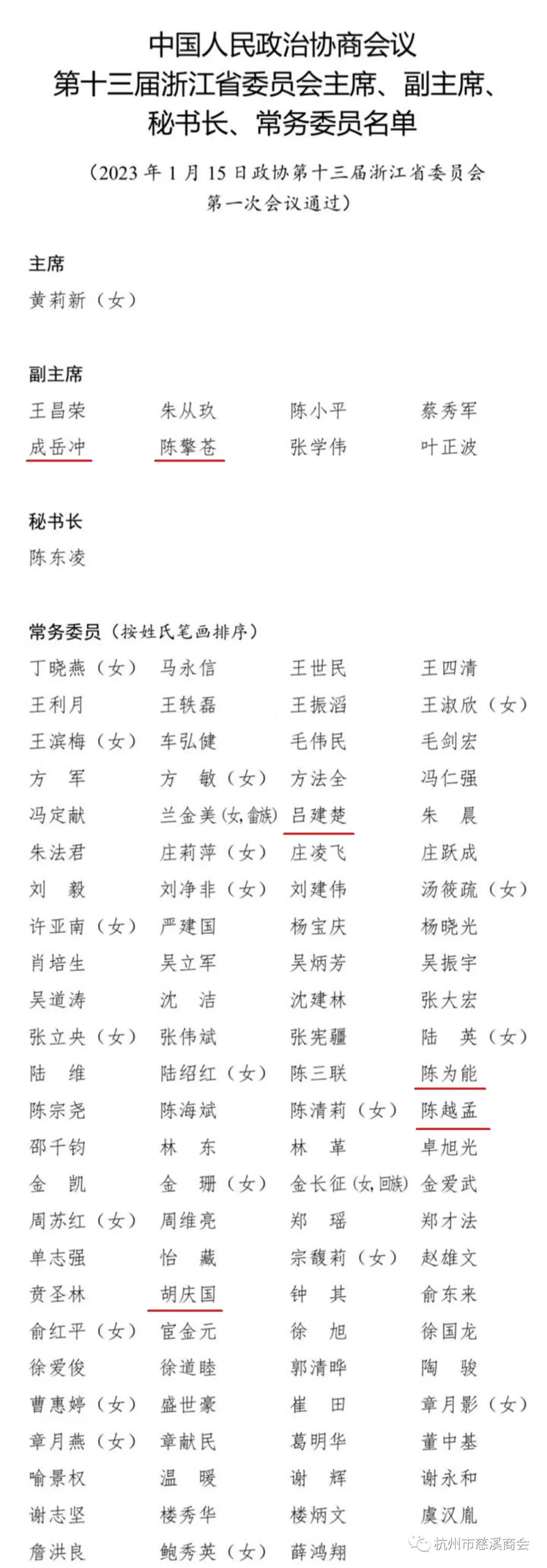 1月15日上午,政协第十三届浙江省委员会第一次会议举行第三次全体会议。选举黄莉新为省政协主席,慈溪乡贤成岳冲、陈擎苍等8人为省政协副主席,陈东凌为秘书长,杭州市慈溪商会(慈溪市杭州商会)陈越孟会长,吕建楚、陈为能、胡庆国等慈溪乡贤为常务委员。杭州市慈溪商会(慈溪市杭州商会)对省政协新一届领导班子的产生表示热烈祝贺,对陈越孟会长等诸位乡贤的当选表示热烈的祝贺。