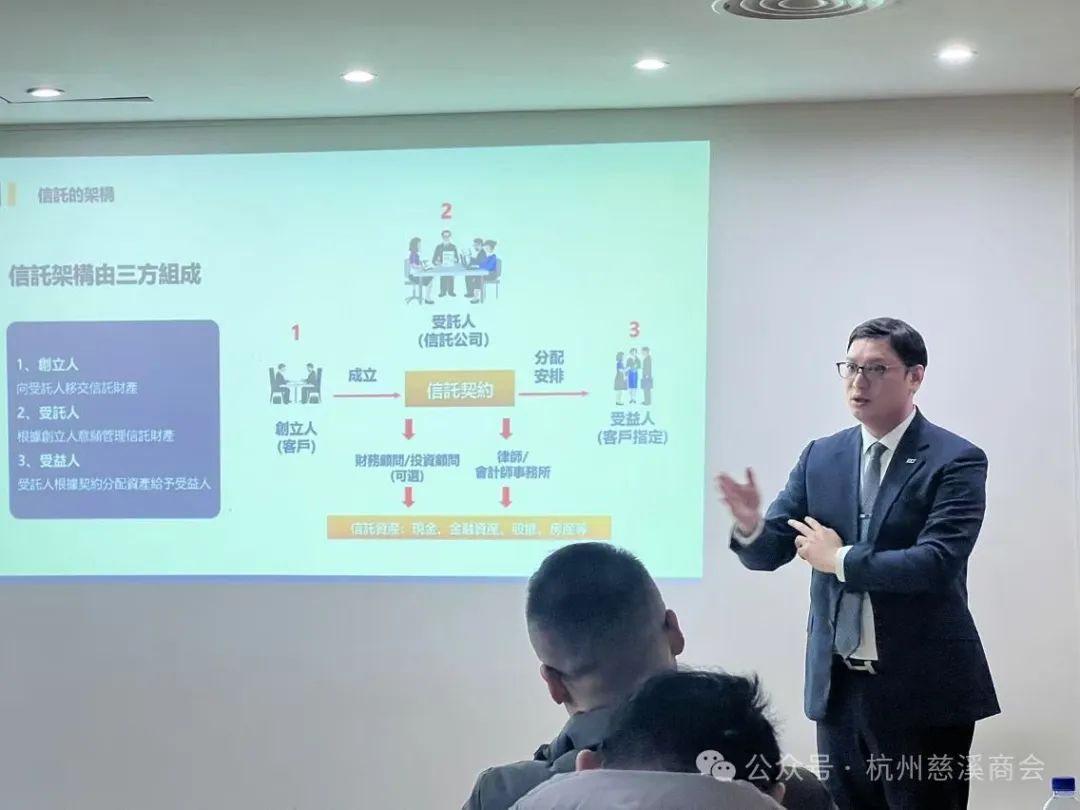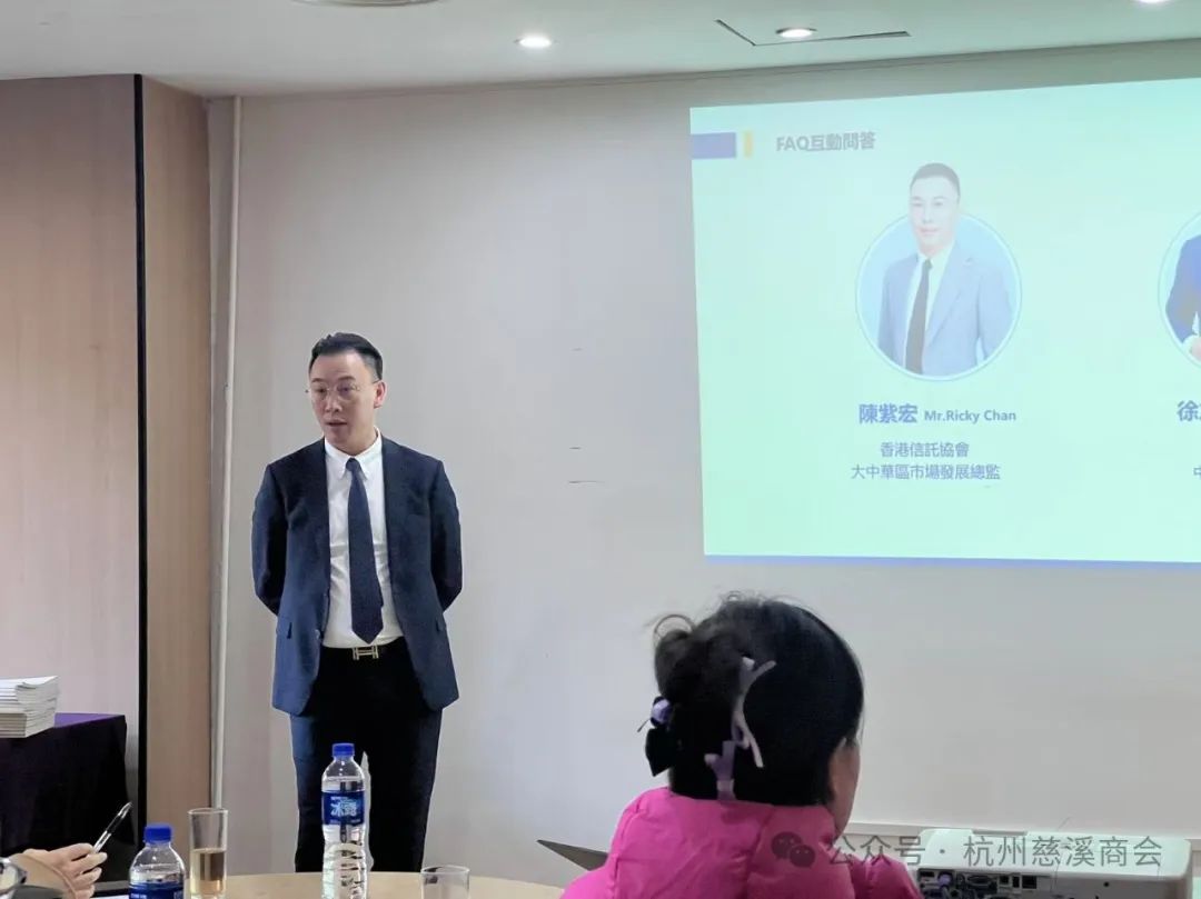 12月8日下午,杭州市慈溪商会副会长、蓝天清水湾国际大酒店董事长范菁华与香港信托协会,在蓝天清水湾国际大酒店,举办的“2024环球私人信托说明会”分享香港信托投资理财等新思路和成功经验。