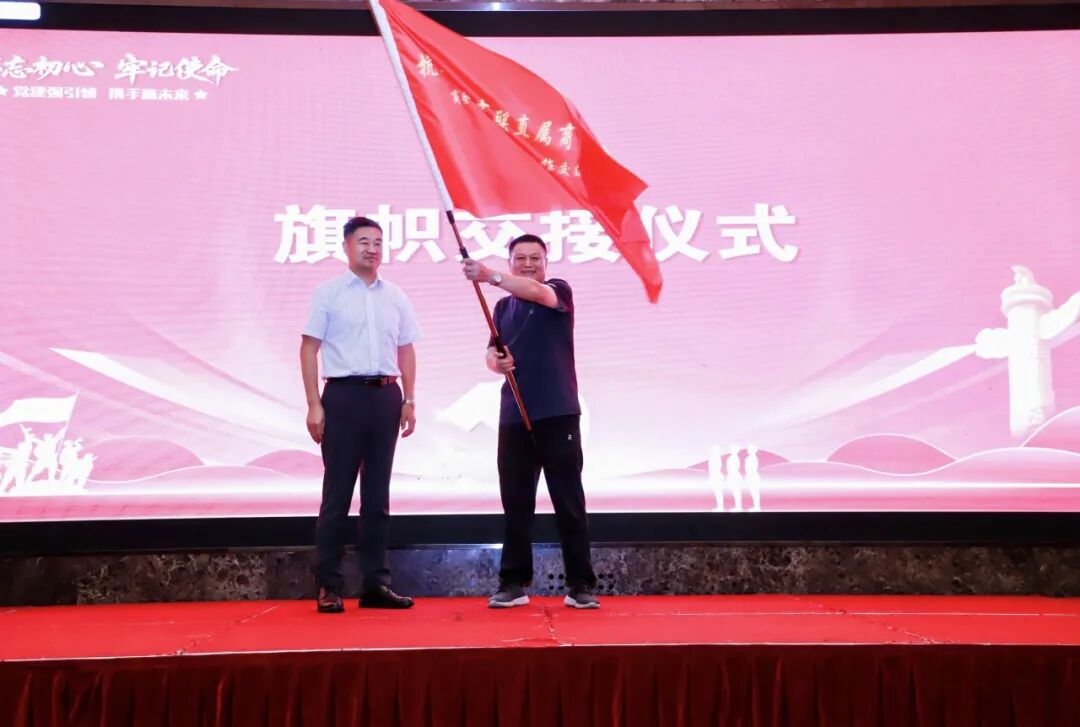 随后,举行了庄严而富有意义的旗帜交接仪式。由杭州岳西商会会长储团结将旗帜交到杭州丰城商会党支部书记刘志华手中。这面旗帜,传递的不仅是一份荣誉,更是一份沉甸甸的责任与担当,寓意着我们党建事业生生不息,接力前行。