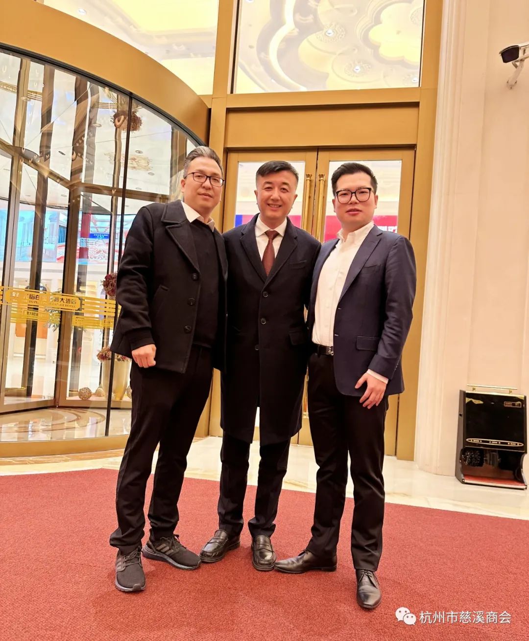 图 上海市慈溪商会会长陈泉苗(中)与杭州市慈溪商会常务副会长王科(左)、副会长方鑫煜(右)合影