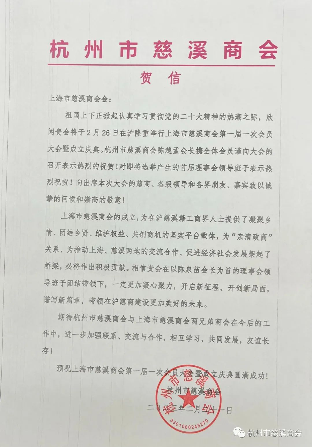 杭州市慈溪商会陈越孟会长携全体会员谨向上海市慈溪商会成立大会的召开发《贺信》表示热烈祝贺,商会常务副会长、华东蓝城房产建设管理集团有限公司董事长王科,副会长兼副秘书长、浙江含泊文旅发展有限公司董事长方鑫煜应邀出席成立大会典礼,热烈祝贺上海市慈溪商会第一届一次会员大会取得圆满成功!对新当选的以陈泉苗会长为首的理事会领导班子成员表示热烈祝贺!相信上海市慈溪商会在以陈泉苗会长为首的理事会领导班子团结带领下,一定更加凝心聚力,开启新征程、开创新局面、谱写新篇章,带领在沪慈商建设更加美好的未来。
