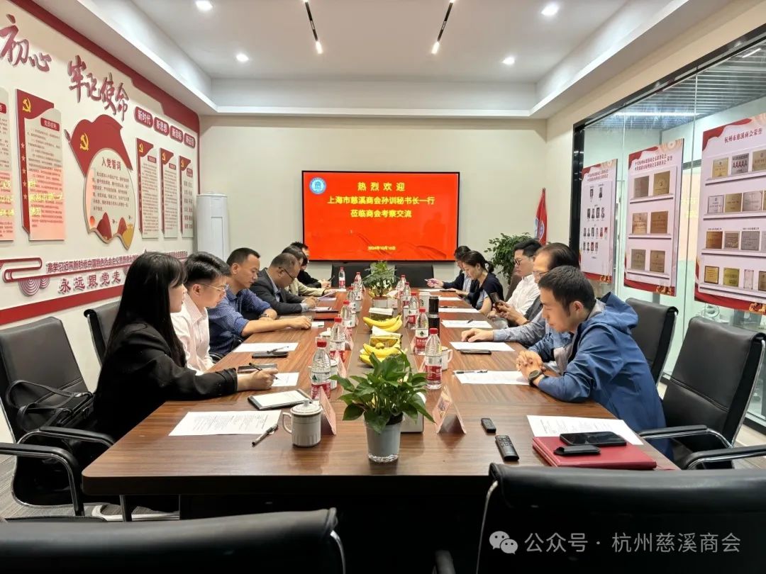 10月16日下午,上海市慈溪商会秘书长、慈溪驻沪办主任孙训一行莅临我会考察交流,受到杭州市慈溪商会常务副会长华晔宇,秘书长沈含惠,副会长兼副秘书长方鑫煜,副秘书长沈丹萍,办公室(党建办)副主任黄承,办公室副主任赵炜炜,秘书徐静云等的热烈欢迎和热情接待。孙秘书长一行参观了慈溪商会《会员之家》并进行座谈交流,
