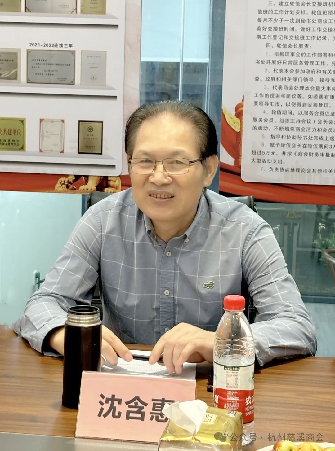 沈含惠秘书长说,2024年商会主要特色工作有下几点:一、坚持轮值会长小组值班制度,加强了商会领导,充分发挥了轮值会长的主动性、积极性和主人翁意识,促进商会创新发展;二、追寻红军足迹,弘扬长征精神。商会党支部每年组织进行红色基地考察教育活动,不断提高领导班子和会员的政治理论水平和队伍素质;三、积极组织活动,增强商会活力。与杭州慈溪经济建设促进会、浙大顾问团、浙大教职工羽毛球协会等联合成功主办、承办了【慈商杯】2024浙江大学在杭慈溪乡贤羽毛球联谊赛,受到好评;四、商会将推行会员小组一活动机制,加强全体会员的参与度,增强会员凝聚力;五、与省肿瘤医院等签订了《健康保障协作协议》,为会员就医、专家门诊、住院和健康体检、停车等方面提供绿色通道和VIP服务;六、是积极开展“联乡结村”帮扶和慈善公益活动等。