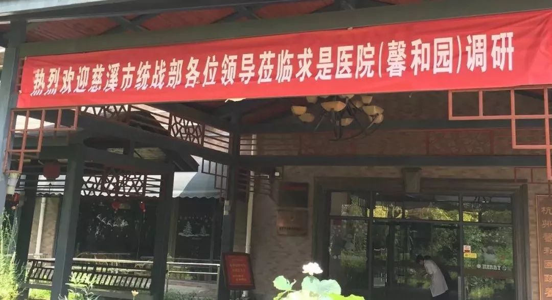 7月18日上午,慈溪市委常委、统战部部长张红军,市统战部正局级干部黄建岳,市统战部部务会议成员、市侨联副主席沈皋安,市工商联副主席陈百挺和统战部办公室卢银鼎等一行莅临杭州市慈溪商会和慈溪市杭州商会副会长单位浙江蓝天清水湾旅业有限公司下属杭州求是医院和杭州馨和园颐养院(医养结合养老机构)考察调研。杭州市慈溪商会和慈溪市杭州商会副会长、浙江蓝天清水湾旅业有限公司总经理范菁华热情接待了张部长一行,商会执行秘书长沈含惠陪同考察调研。上图范菁华总经理(左2)向张红军部长(右2)一行介绍馨和园颐养院的情况范菁华总经理对慈溪市委统战部张部长等领导莅临考察批导表示热烈欢迎和衷心的感谢!并亲自给张部长一行介绍了杭州求是医院和杭州馨和园颐养院运作情况:他说,2014年7月,公司在位于杭州市下城区沈家路108号,建成了第一家建筑面积40000余平方米,有800张床位的杭州馨和园颐养院,由杭州求是医院作健康保障配套,正式向社会开放,缓解了杭州社会养老机构不足、养老床位一张难求,养老难的问题,得到了广大养老人群和家人的认可和喜爱,深受社会的高度关注和肯定,也得到了当地政府的大力支持和好评,社会效益和经济效益都比较好。现在杭州馨和园颐养院已有一定的知名度和影响力,床位还是供不应求。馨和园颐养院被评为浙江省医养结合示范点、浙江省养老机构最美家园称号、杭州市消费者最爱的养老服务业等荣誉。上图范菁华总经理向张红军部长介绍馨和园颐养院情况范总说:公司除了馨和园颐养院,现在绍兴市中心也投资建设了一个医养结合的养老机构,在杭州之江渡假区大清谷龙谷度假村医养结合养老机构项目也将建设完成。范总陪同张部长一行参观了杭州馨和园颐养院和杭州求是医院,参观了养老院的居住房间和活动场所,张部长还询问了一些院里居住养老的老人们生活是否适应、满意?老人们都说在这里生活非常开心,服务很贴心、周到,非常好,生活很幸福。上图范菁华总经理(左3)陪同张红军部长(右2)一行参观馨和园颐养院上图范总陪同张部长一行参观,这对老夫妻说在这已住了四年,生活非常开心、满意。上图馨和园颐养院每楼层的护士服务台上图养老院老人的书法作品展上图馨和园颐养院的休息大厅张红军部长对馨和园颐养院良好的居住条件、齐全的配套设施、清洁卫生、优美的生活境环及医院病房式的护理服务,赞叹不已,并高度赞赏了馨和园颐养院。医养结合的养老机构确实非常好,为社会、家庭解决了