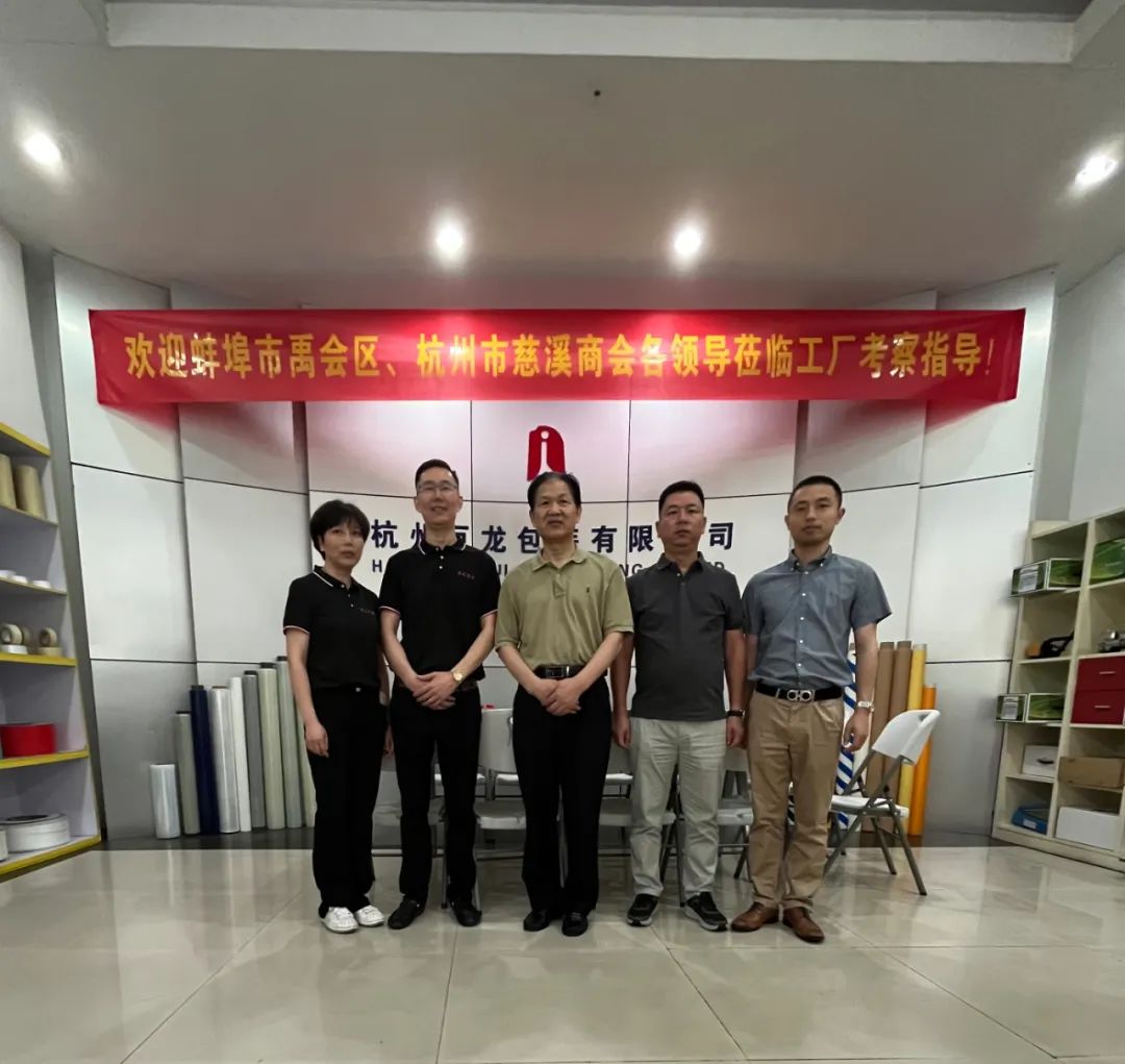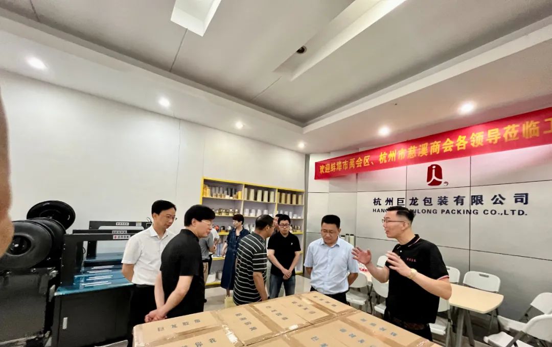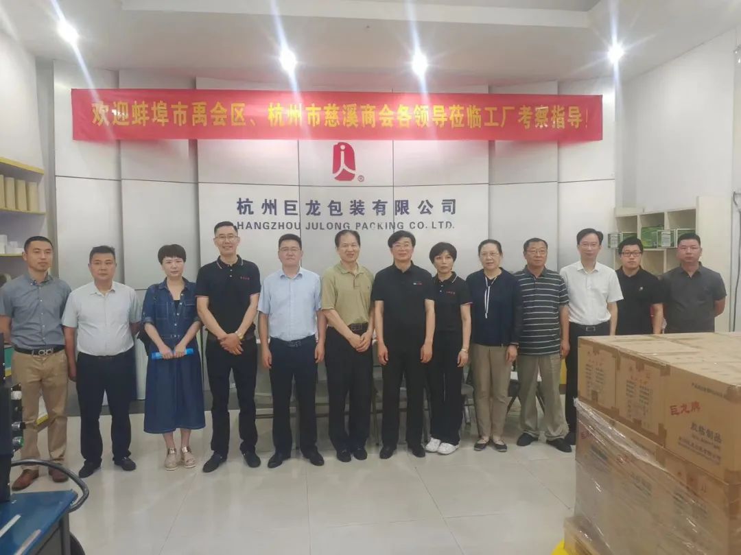 6月8日上午,安徽省蚌埠市委统战部常务副部长高健清一行,在杭州市慈溪商会秘书长沈含惠等陪同下,来到杭州市拱墅区康中路16号的杭州巨龙包装材料有限公司考察,受到蒋浩权总经理和夫人施央群的热烈欢迎。随同考察的领导:蚌埠市禹会区政协党组书记、主席王克玲,禹会区区委常委、统战部部长、常务副区长崔海锋,禹会区委统战部常务副部长李志,禹会区委统战部副部长、区工商联党组书记李雪芹,禹会区发改委副主任(慈溪市挂职干部)陆挺,禹会区科技经信局副局长(慈溪市挂职干部)杜成勇,禹会区投资促进局副局长李军等。