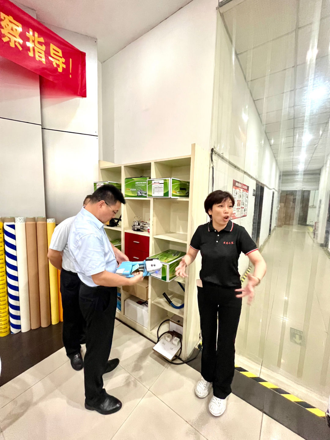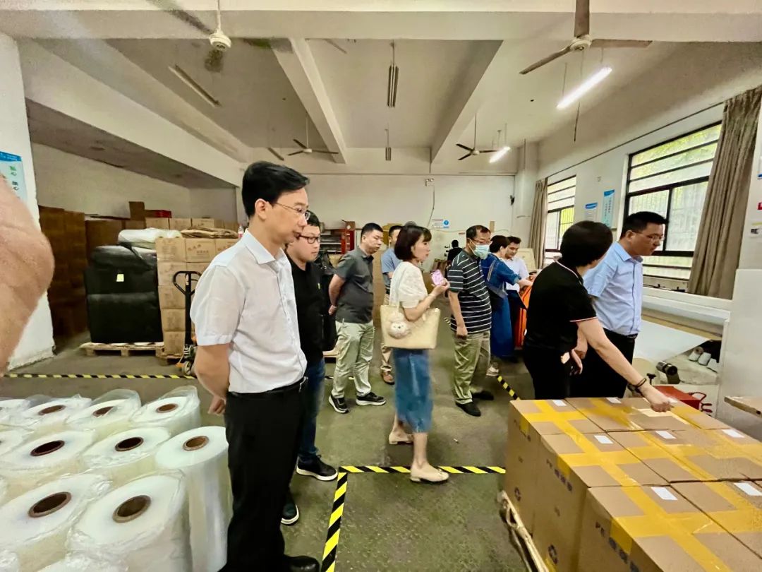 蒋浩权总经理对高健清部长一行的莅临巨龙包装考察指导表示热烈欢迎和衷心的感谢!向高部长一行介绍了巨龙包装公司的发展历程和产品研发、生产和销售情况,并陪同高部长一行参观了生产车间、产品陈列室等。特别是巨龙包装自己研发设计的手持锂电池包装机,可以用于大型设备、产品的打包,功能与进口的一样,但价格是进口的十分之一,深受客户欢迎。