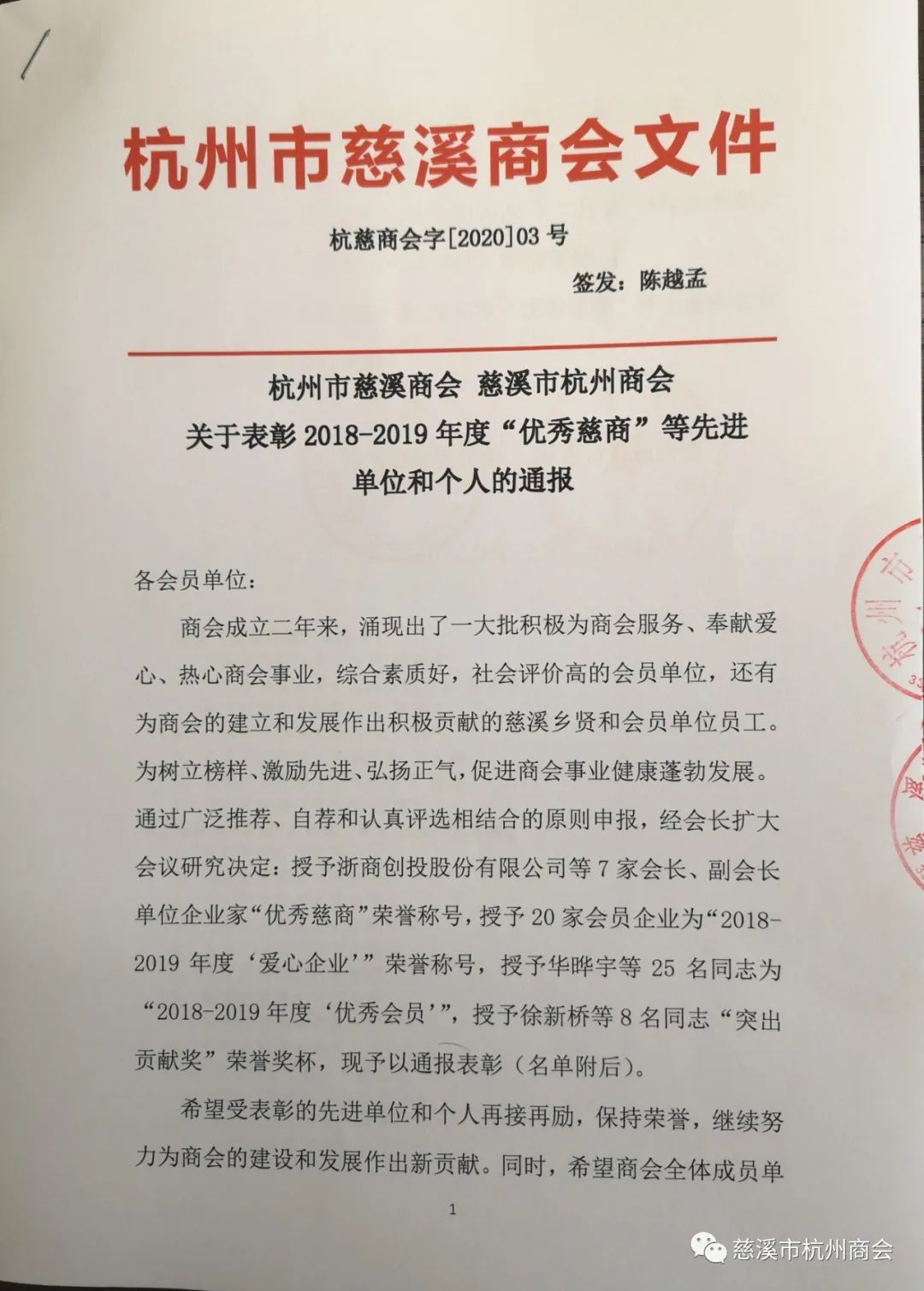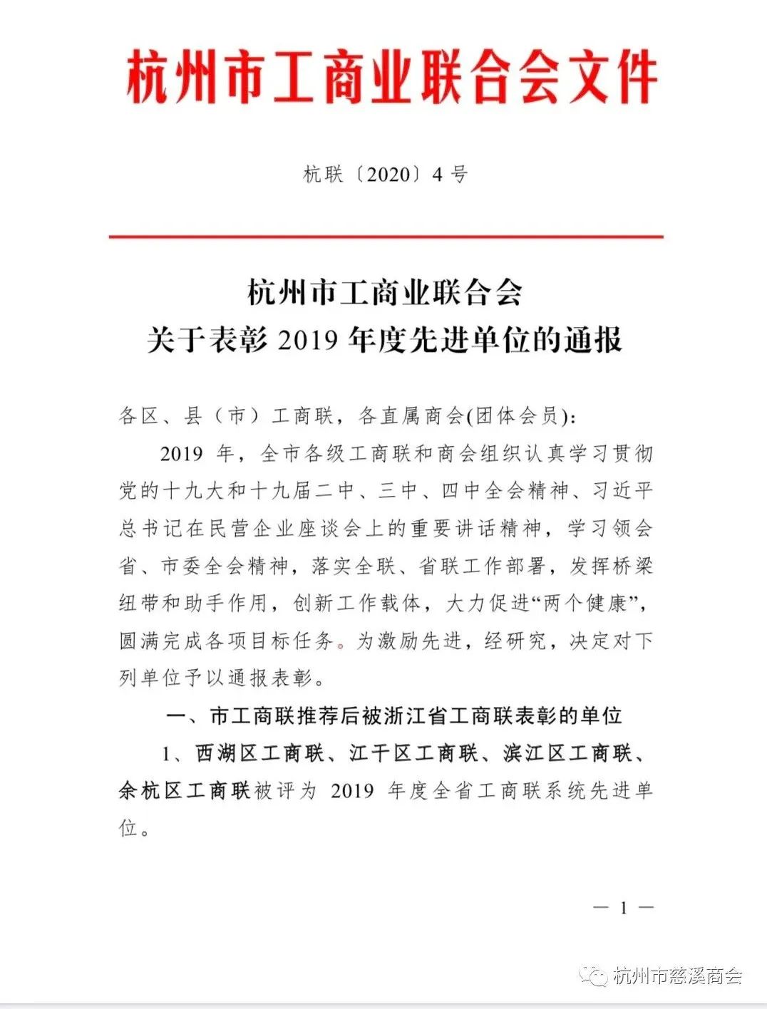 今天,收到浙江省工商业联合会《关于认定2020年四好商会的通报》,杭州市慈溪商会荣获2020年浙江省四好商会荣誉称号。杭州市慈溪商会自2018年7月注册成立以来,在杭州、慈溪两地党委、政府的正确领导下,在上级主管部门和社会各界朋友的关心支持下,在以陈越孟会长为首的理事会领导班子的团结带领下,坚持以习近平新时代中国特色社会主义思想为指导,坚持以服务会员为中心,牢固树立四个意识,紧紧围绕两个健康发展,结合年度活动主题,严格遵循章程和制度规定,商会发展健康有序,凝聚力不断增强,经全体会员的共同努力下,商会各项工作都取得了较好的成绩和进步。2019年被评为杭州市四好商会,被首届(2020)世界会长大会组委会评为抗疫先进社会组织,现又被评为省四好商会。这些荣誉的取得是对慈溪商会工作的肯定和鼓励,更是对商会今后工作的鞭策和激励,慈溪商会一定努力把商会建设搞得更好。通知原文