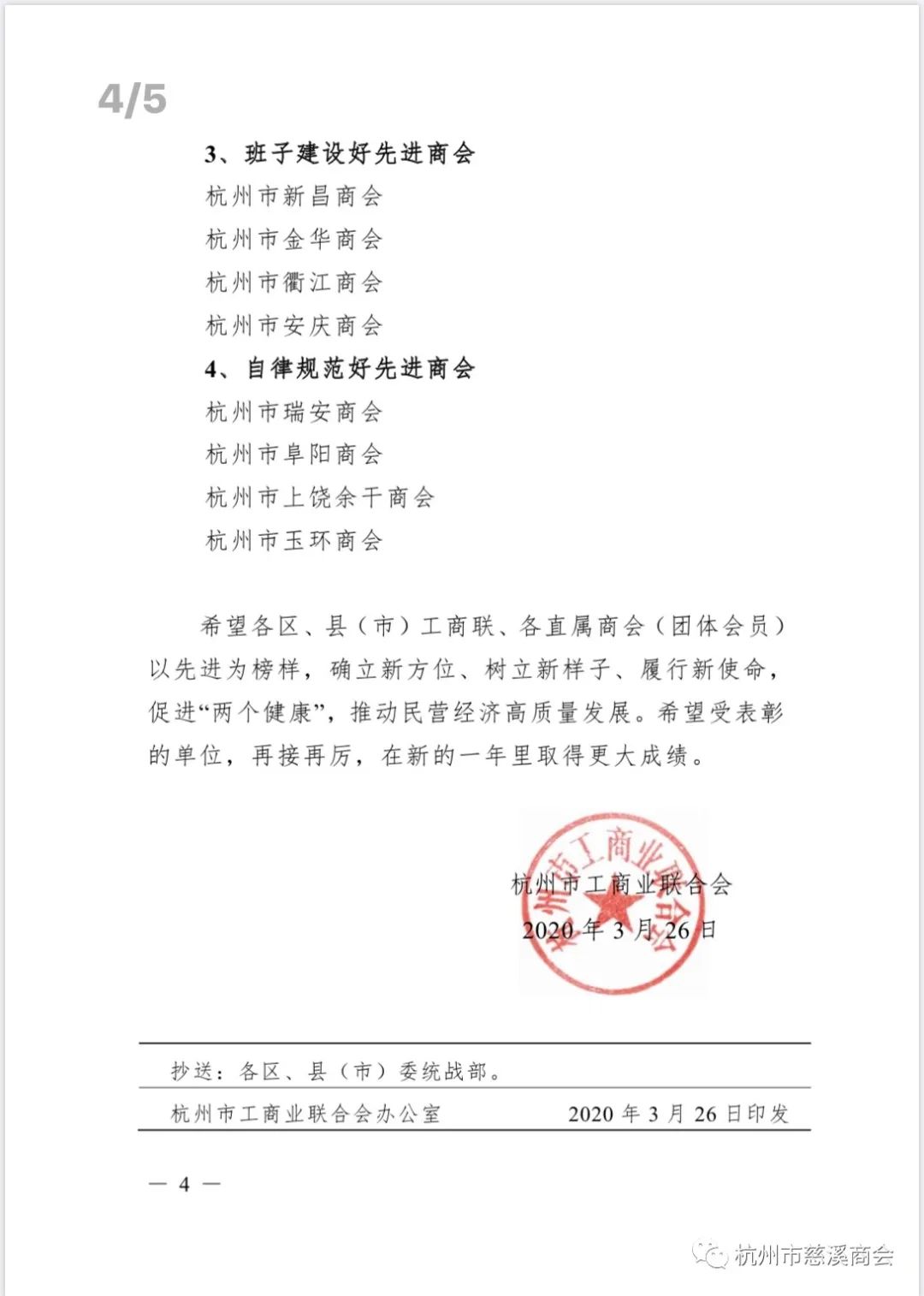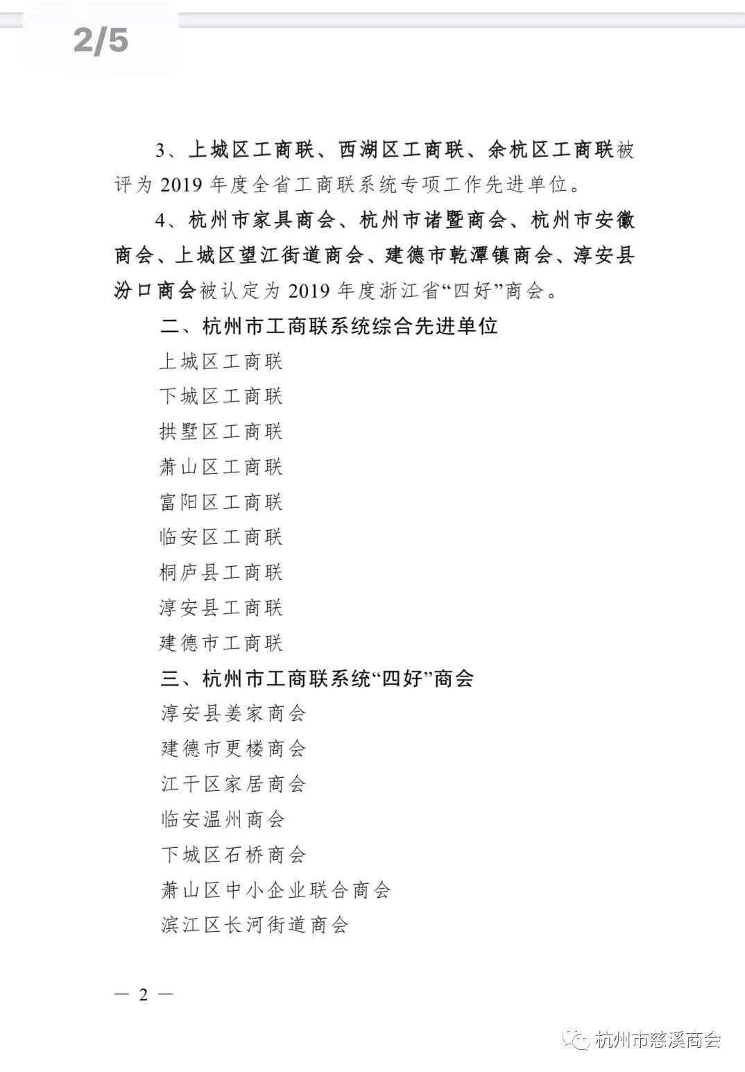 4月2日,杭州市工商业联合会发布《关于表彰2019年度先进单位的通报》,杭州市慈溪商会荣获杭州市工商联系统“四好”商会荣誉称号。这是上级主管机关对慈溪商会工作的充分肯定和鼓励。也是以陈越孟会长为首的理事会领导班子团结带领全体会员共同努力的结果,是慈溪商会全体会员的荣誉,也是我们在杭慈溪人的光荣。“四好”商会荣誉是慈溪商会工作的新动力和新起点,努力把商会各项工作做得更好。