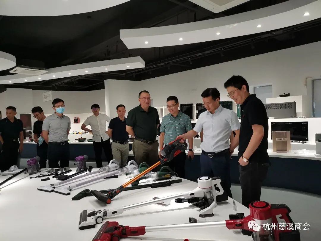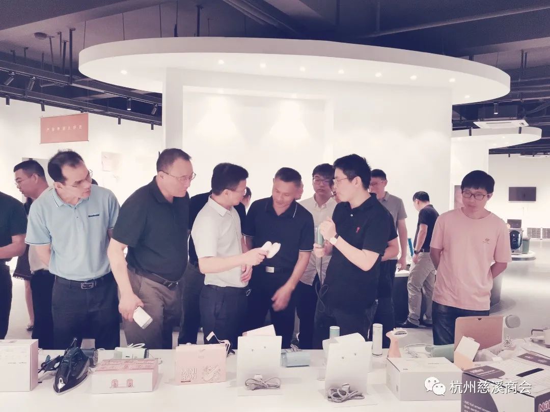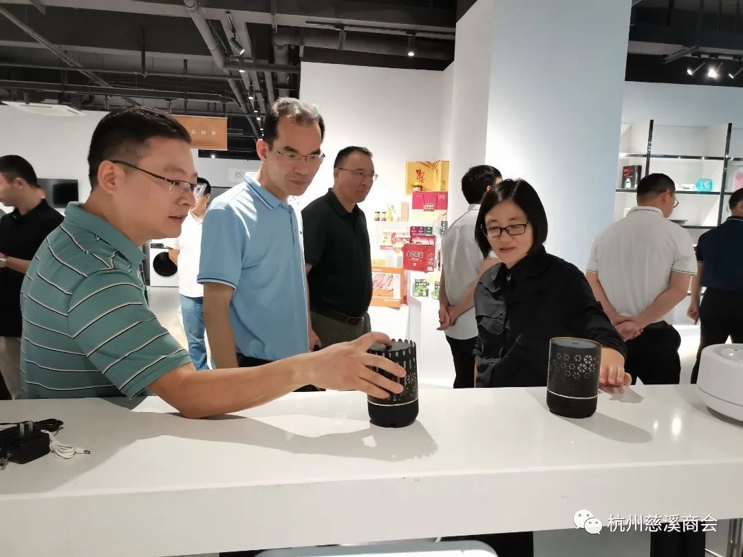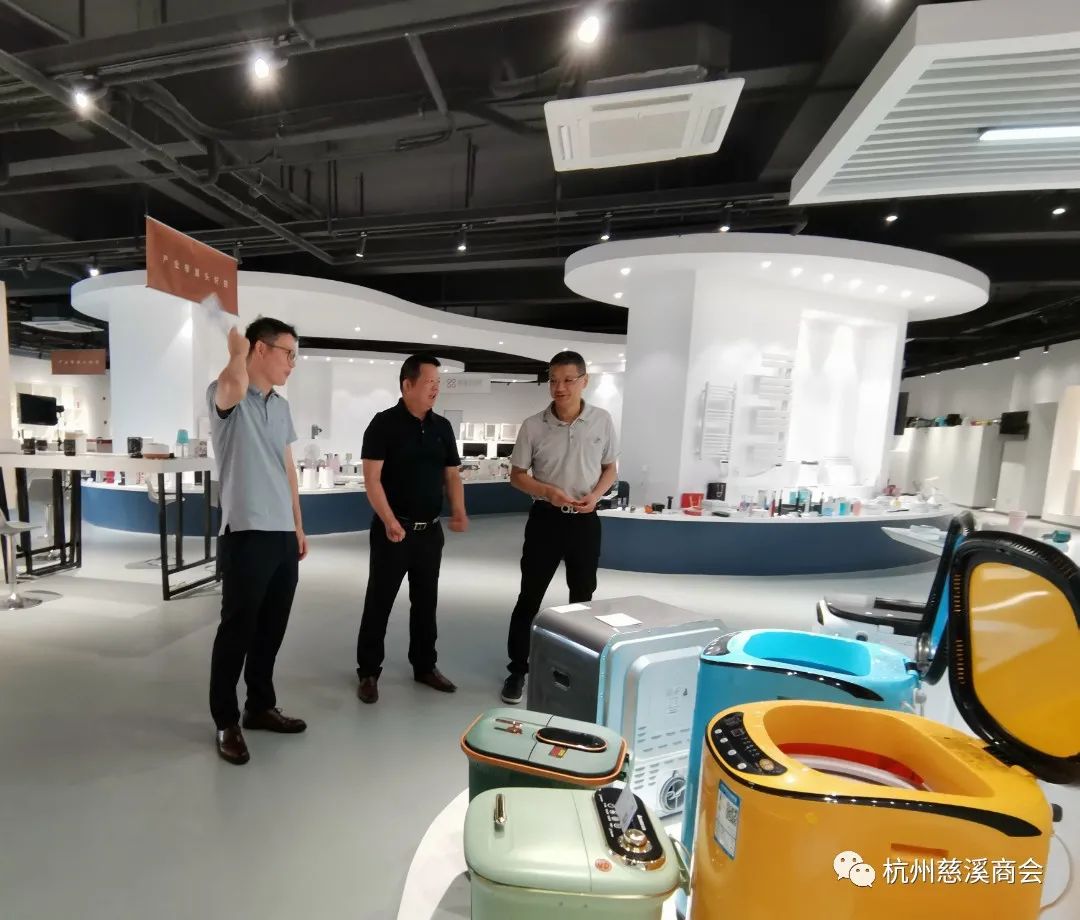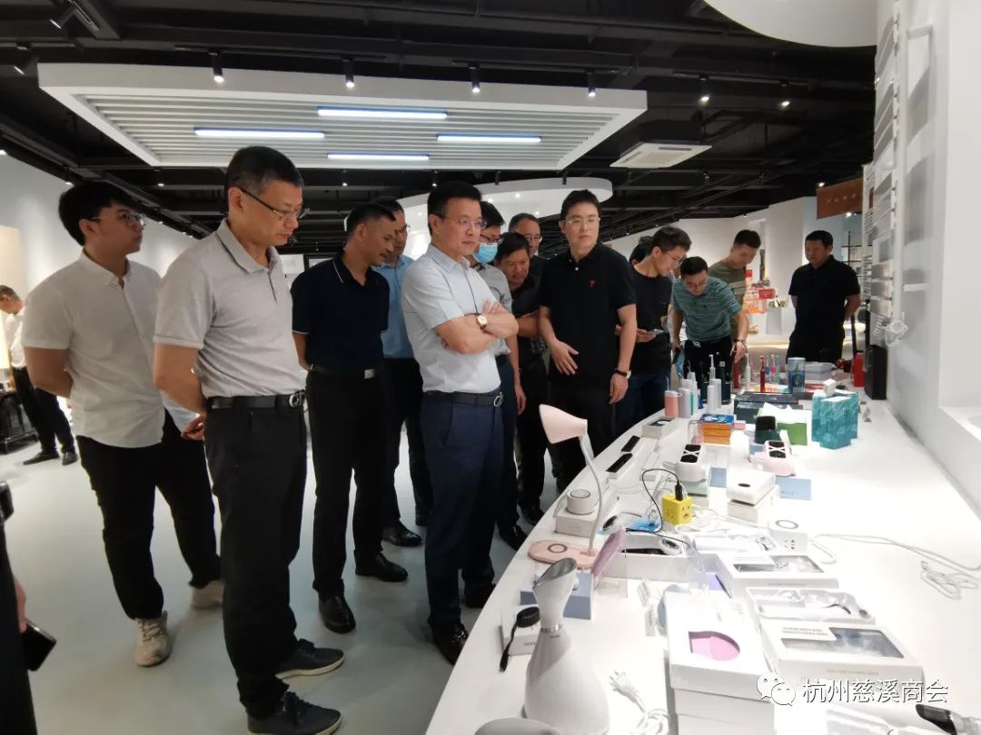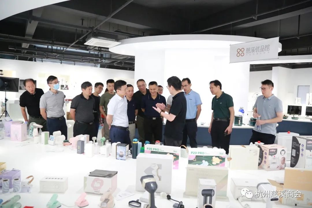 余雪辉会长一边引领一边给大家做详细介绍,从2013年开始,他就发起“慈溪家电馆”项目,助推慈溪中小家电企业进行网络销售。今年2月初由慈溪市商务局会同市商贸集团牵头推进,慈溪产业带直播基地(慈溪优品馆)盛大开馆,一共8000多平米,意在引进一批直播平台资源、MCN机构、数字内容生产及直播技术服务等相关企业,集聚一批有意发展直播业务的慈溪产业带企业,打造一个汇集新零售品牌直播、主播培训、实体展示、供应链整合等服务资源的直播电商公共服务平台。