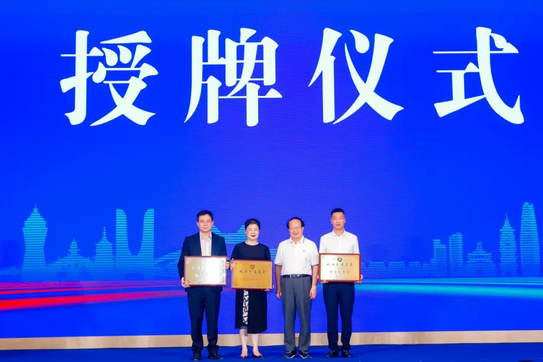 图 浙江省政协原副主席、慈溪商会名誉会长张蔚文为杭州白金汉爵文旅开发有限公司浙沪区域董事长胡哲明(左一)授牌