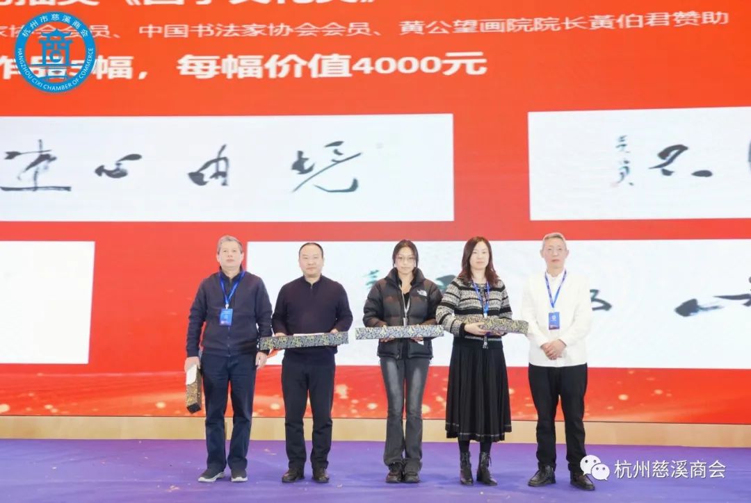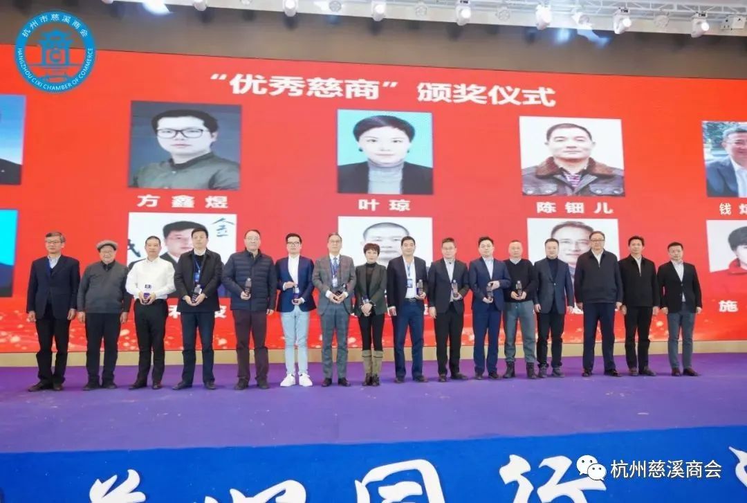 浙江省政协原副主席张蔚文,杭州宁波经促会会长王剑侯,慈溪市委副书记、市长章程,慈溪市委常委、统战部长马焕勇,慈溪杭州经促会会长赵彦年和杭州市慈溪商会会长陈越孟等领导为杭州市慈溪商会10位优秀企业家颁发“优秀慈商”荣誉称号荣誉奖杯。“优秀慈商“称号是商会的最高荣誉。他们是广大在杭慈商的杰出代表,为杭州慈溪两地的社会发展和经济建设作出了突出贡献。这是商会第三届评选出的"优秀慈商“企业家。