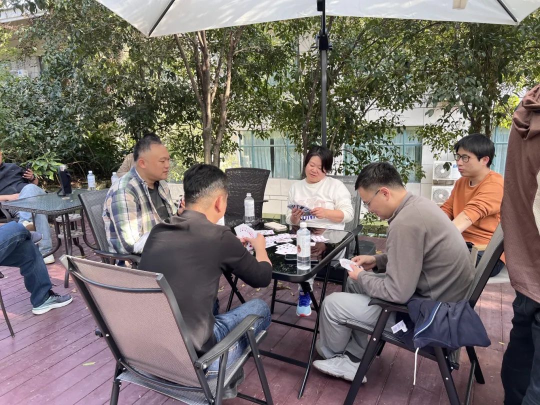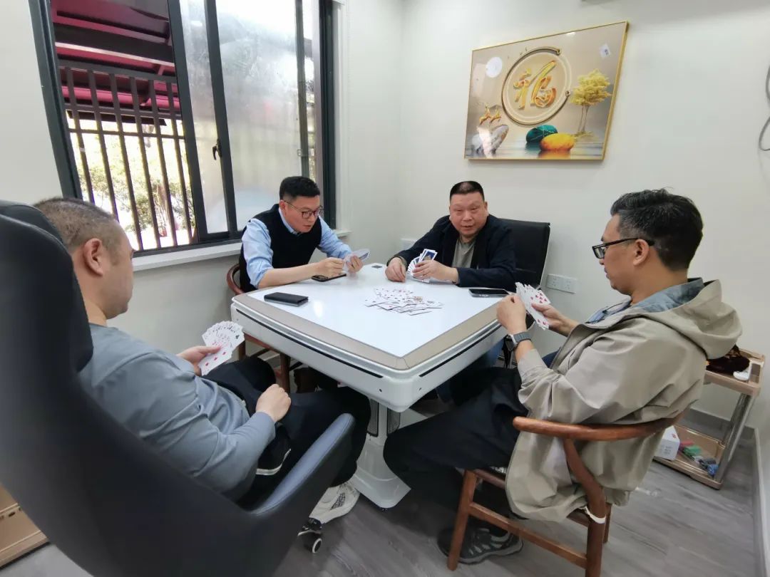 下午15:30时,登玉皇山的活动圆满结束后,会员们前往位于西湖风景名胜区莲花峰路37号,蓝天清水湾国际大酒店院内的杭州市慈溪商会新落成的《会员之家》开展掼蛋、麻将友谊比赛,喝茶交流活动。在会员之家和室外的桂花树下,沐浴在温暖的春风中,好不惬意。掼蛋的玩法还有部分会员不太熟悉,大家相互指导、边打边学,不亦乐乎。