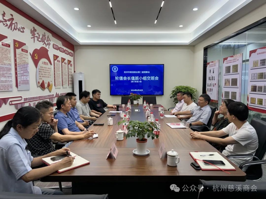 6月30日下午,杭州市慈溪商会第二届理事会轮值会长第四、第五值班小组工作交班会议在西湖风景名胜区莲花峰路37号,浙江蓝天清水湾国际大酒店慈溪商会《会员之家》会议室召开。