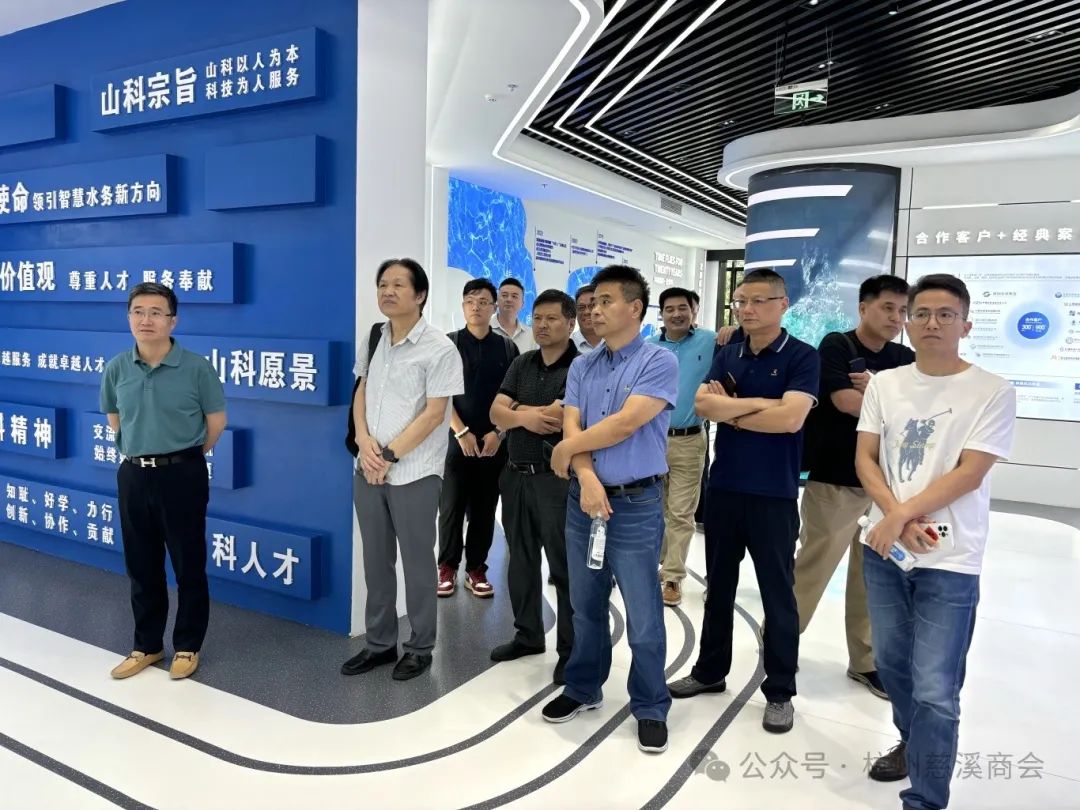 商会一行在钱董事长的带领下,首先参观了山科智能综合展厅。展厅分为发展历程、荣誉资质、合作客户+经典案例、发明专利等模块,充分展现了山科智能为达成“领导智慧水务新方向”这一使命而付出的努力,与会人员都对山科智能的产品、技术、服务等方面给予了高度评价。