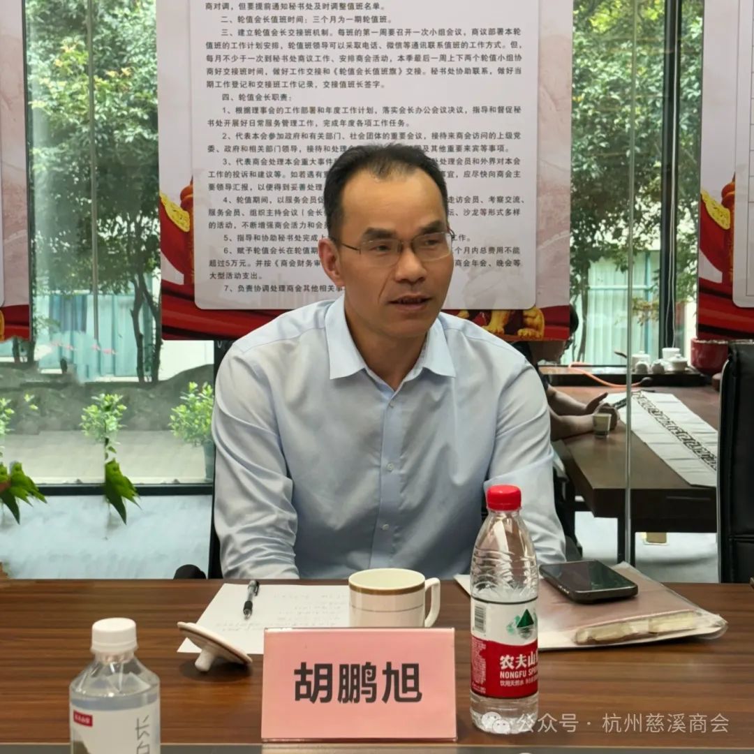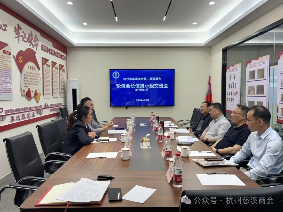 4月8日下午,杭州市慈溪商会第二届理事会轮值会长第七、第八值班小组交班接工作会议在杭州市莲花峰路37号的杭州市慈溪商会《会员之家》召开。