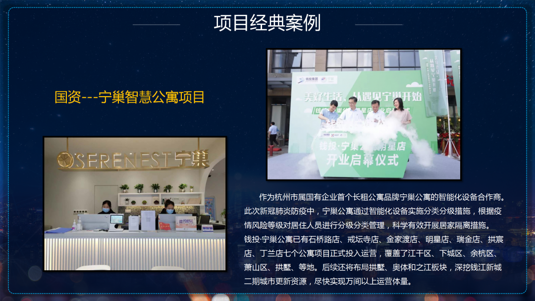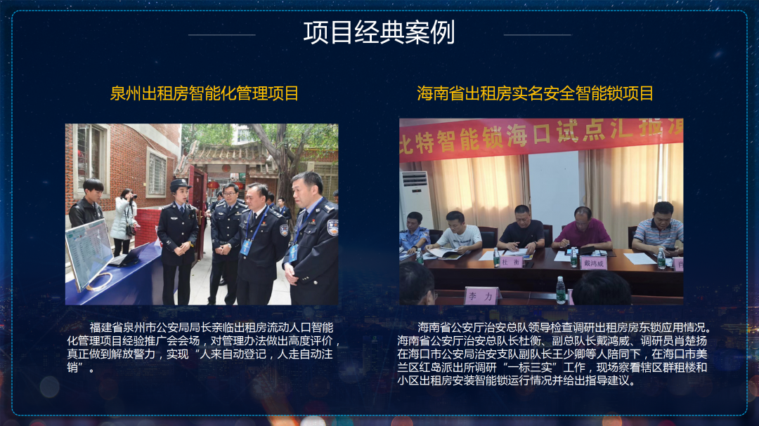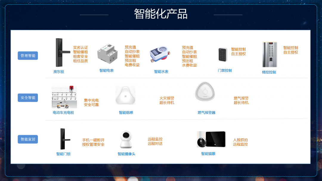 公司产品主要围绕家居智能安全展开,截止目前,已自主研发多款智能门锁生态链产品,提供多项居住场景解决方案,广泛应用于用户安全智能家居及公安流动人口管理等相关行业。