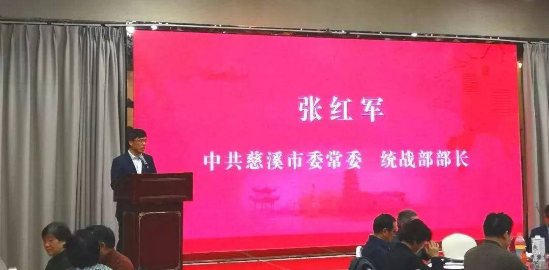慈溪市委常、统战部长张红军代表市委高庆丰书记和四套班领导在会上致辞,他说,今天我们把在杭的慈溪籍乡贤、专家、慈商精英们请到这里参加“慈溪籍在杭乡贤迎春联谊会”,大家欢聚一堂,表达三层意思。一是代表市四套班子领导和家乡人民对在杭乡贤、专家、企业家在过去的2019年对家乡经济建设和发展的关心、支持和帮助,表示感谢和慰问;二是向大家通报去年慈溪经济建设、社会发展等各方面都取得了非常好的成绩。慈溪经济建设迈入新时代,进入快车道,前湾新区建设、 慈溪高铁站将动工建设、长三角一体化融合加速,杭绍甬"浙江第一路"也迎来了"智慧第一路"的智慧高速公路经过慈溪,宁波科技学院在慈溪建成使用等等,给慈溪发展带来良好机遇和利好条件,慈溪经济将会高速腾飞发展。欢迎在杭乡贤和慈商企业为家乡经济建设发展作出新的更大贡献;三是祝福,猪随新风辞旧岁,鼠兆丰年报春来,在传统的新春佳节即将到来之际,给各位老乡拜个早年,祝大家新春快乐,鼠年大吉,家庭美满、事业发达,万事如意!