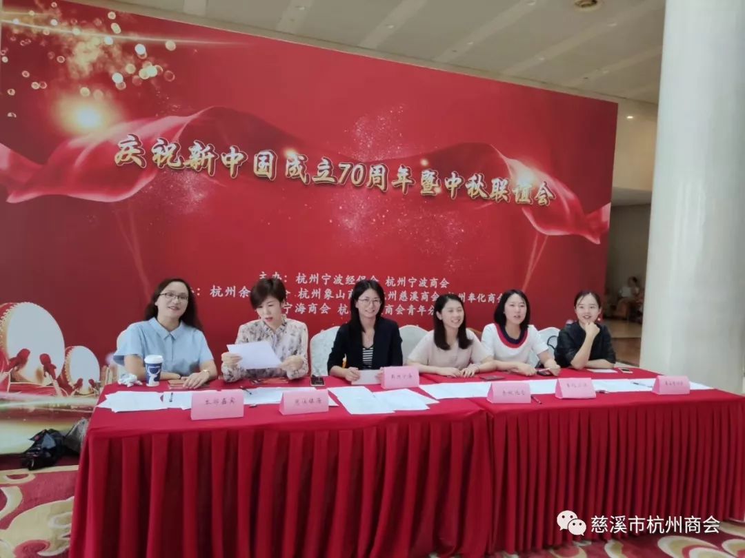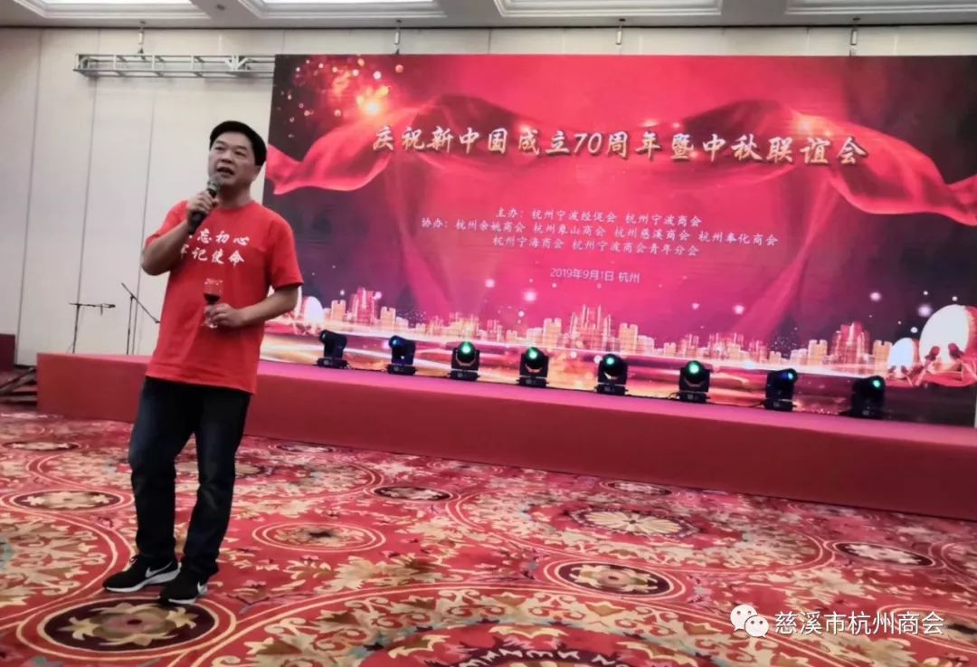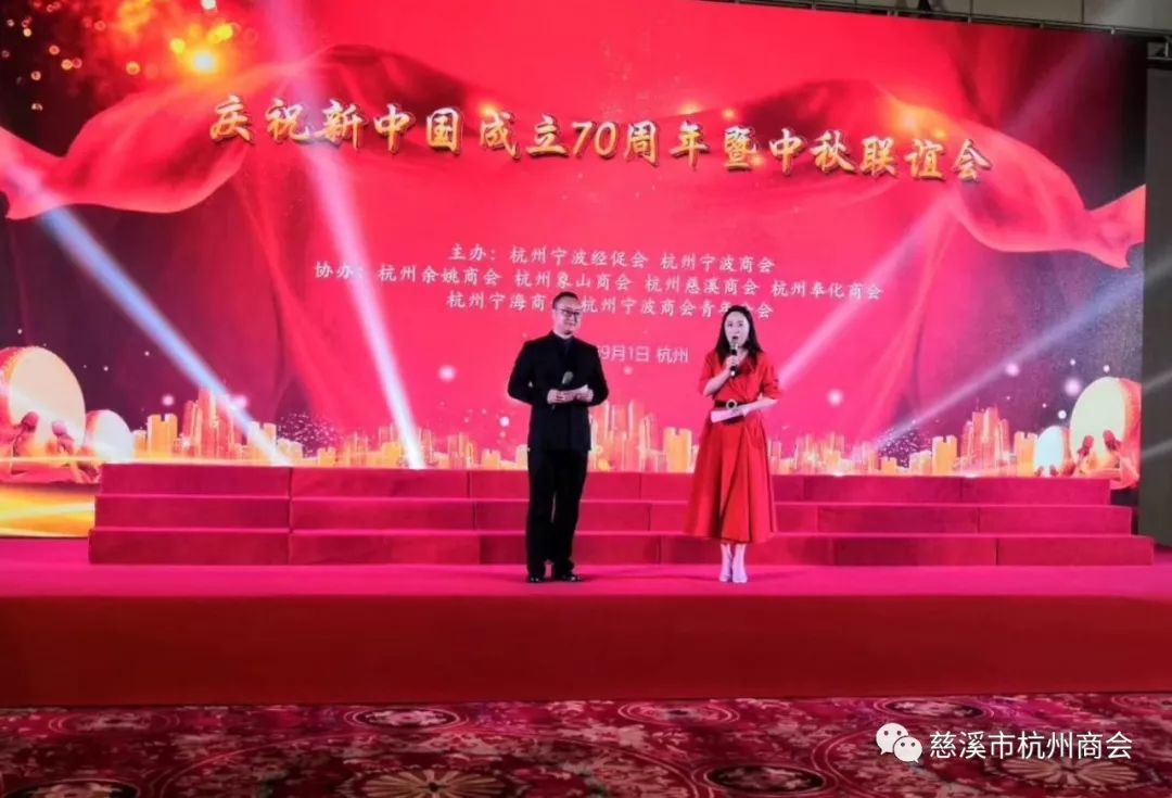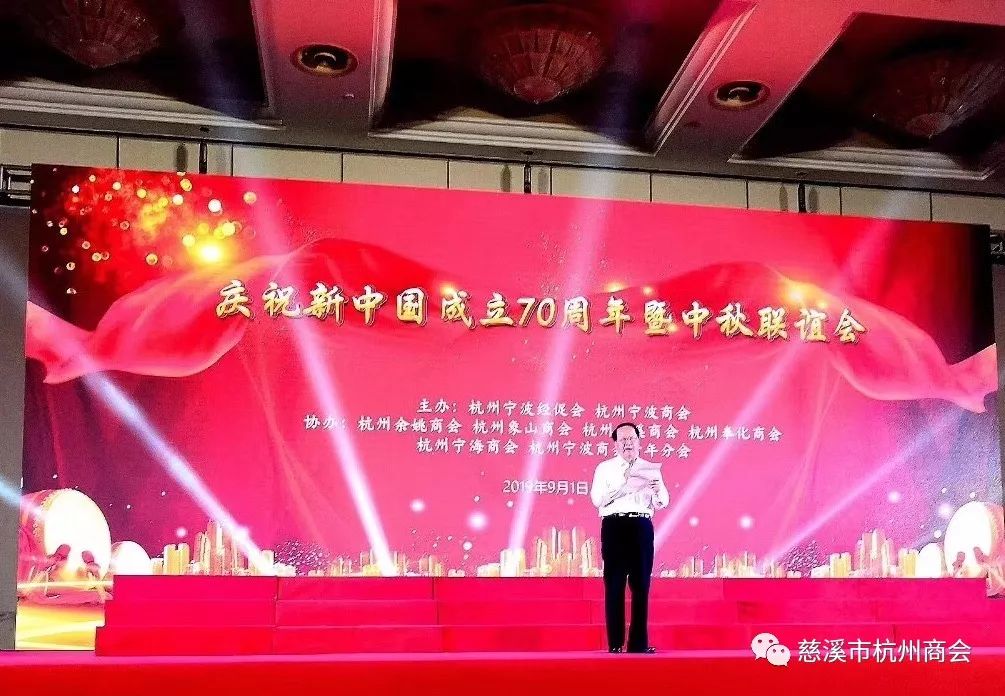 9月1日,杭州宁波经促会和杭州市宁波商会主办,杭州市慈溪商会、余姚、象山、奉化、宁海商会和宁波商会青年分会等六家商会协办的“庆祝新中国成立70周年暨中秋联谊会”在省人民大会堂宴会厅隆重举行。宁波地区在杭乡贤、企业家和当地主管部门嘉宾近400人应邀参加了活动,慈溪经促会和慈溪商会有40多人应邀参加了庆祝联谊活动。大家欢聚一堂,共同庆祝我们伟大的中华人民共和国成立70周年,共同欢度中秋联谊活动,观看各个商会选送的文艺节目,许多会长带头登台献艺演出,歌唱伟大祖国等精彩节目,深受大家热烈欢迎。