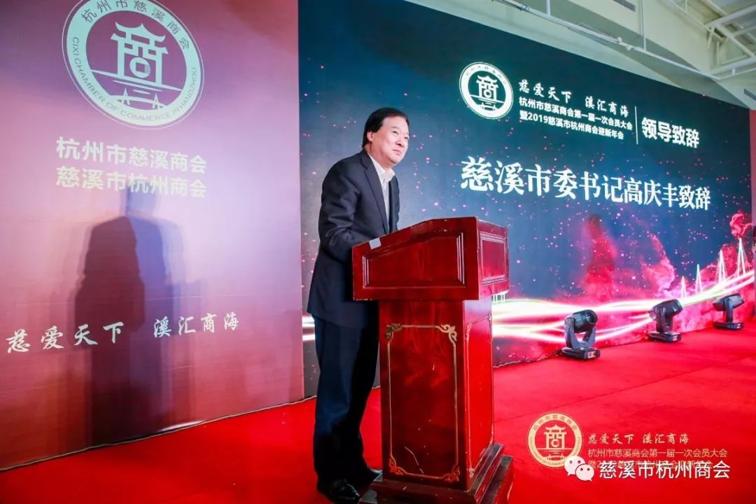 慈溪市委书记高庆丰在致辞中说,在这岁序更替、华章日新的美好时刻,杭州市慈溪商会一届一次会员大会暨2019慈溪市杭州商会迎新年会在美丽的西子湖畔举行。首先,我代表慈溪市委、市人大、市政府、市政协,向新成立的杭州市慈溪商会和迎新年会的召开表示热烈的祝贺!向前来参加晚会的各位领导、各位嘉宾表示热烈的欢迎!