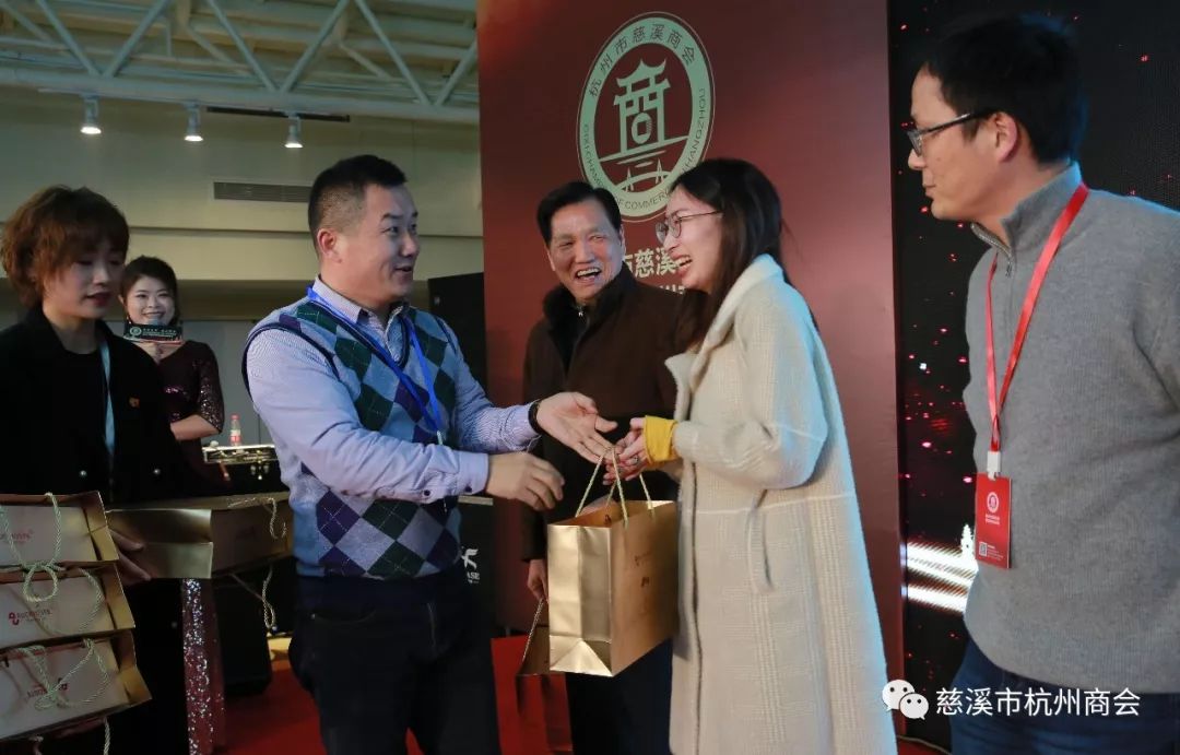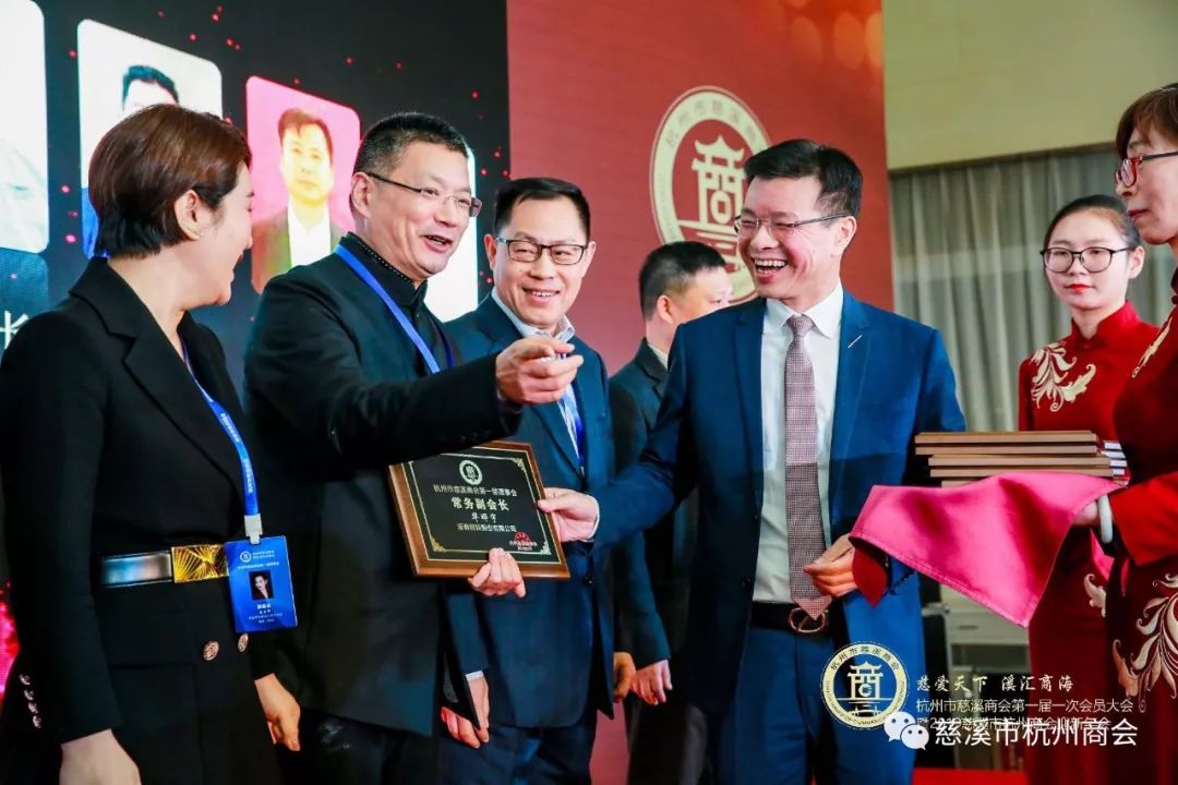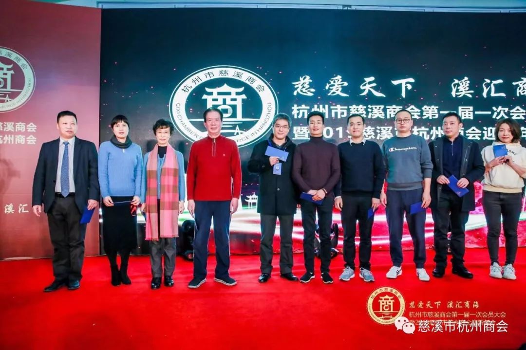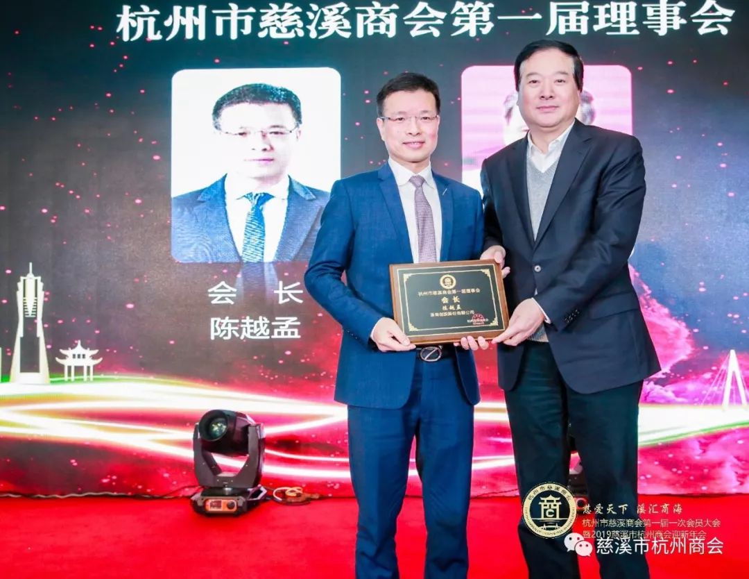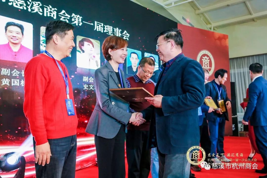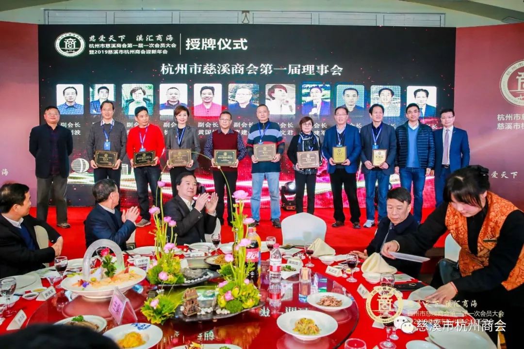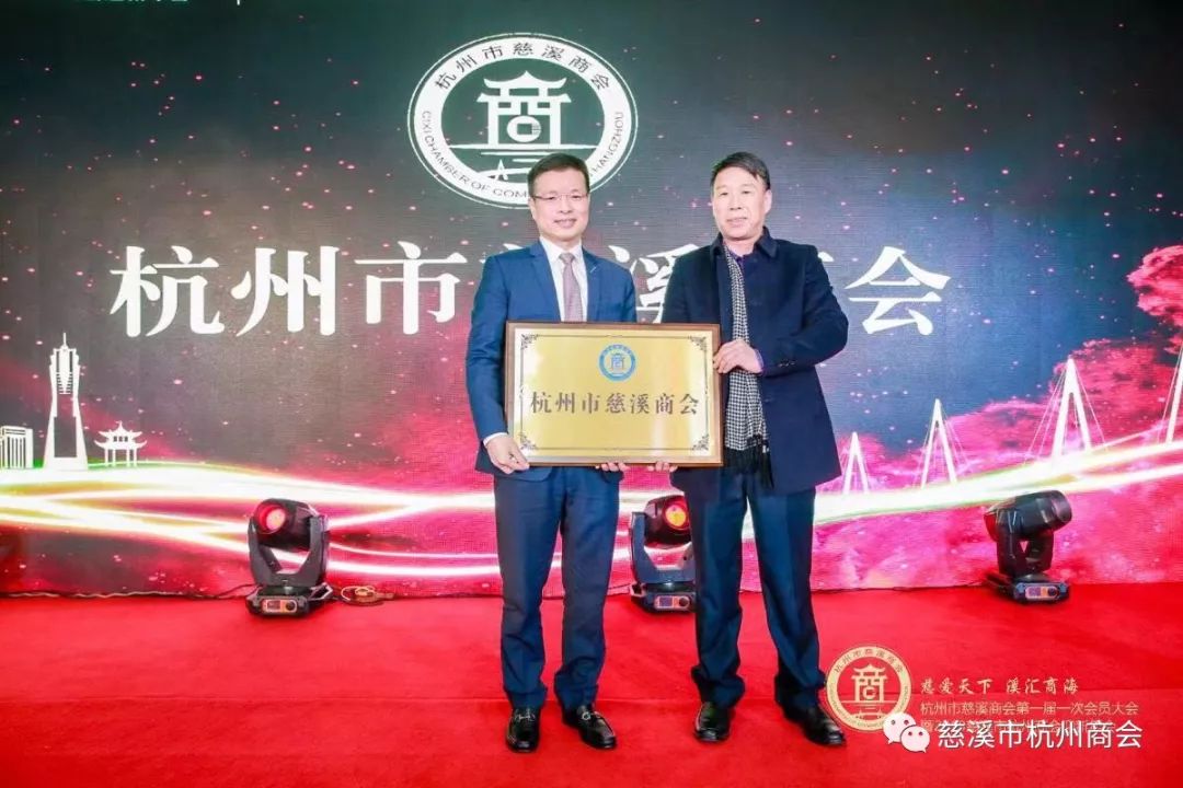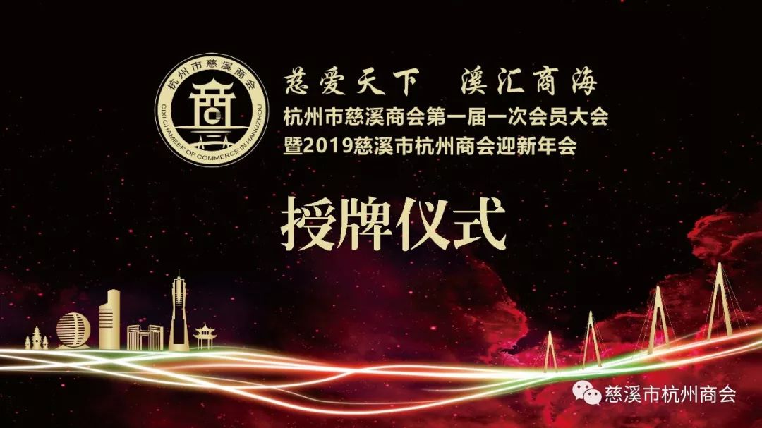 首先是杭州市工商联党组成员、总商会秘书长黄凯旋授《杭州市慈溪商会牌》,陈越孟会长接牌